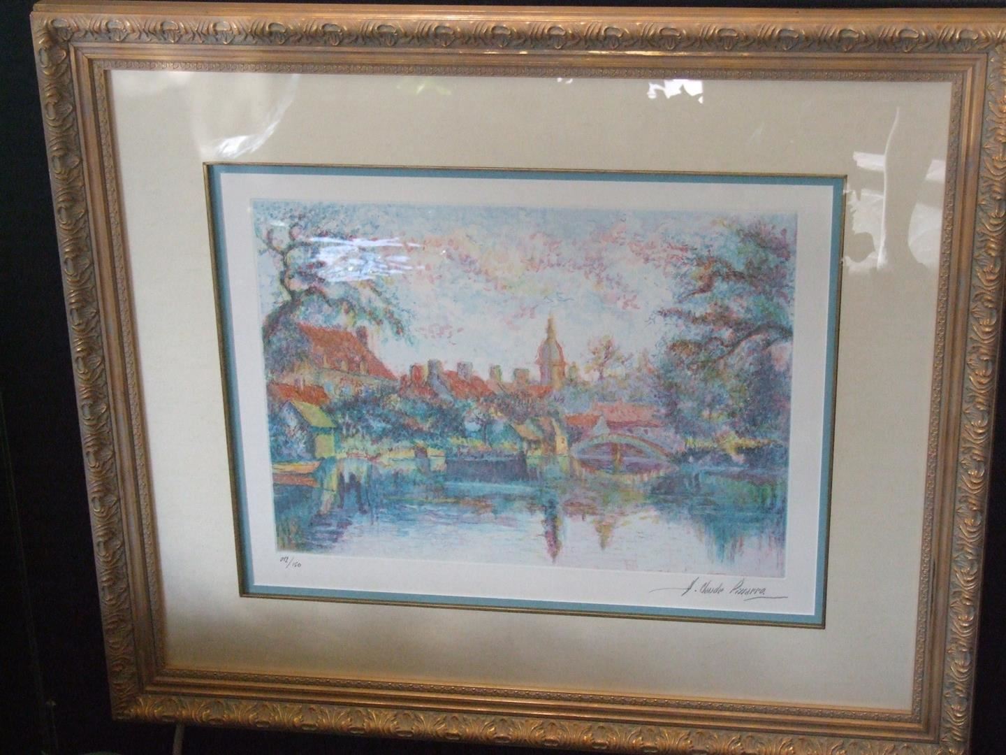 The landscape of a quaint country village, church steeple and footbridge reflects in a lake in the foreground in this limited edition stone lithograph by N. C. Pissarro. The painting (edition #12/150) measures 16.5 x 21.5; framed image measures approx. 28.5 x 33.5.