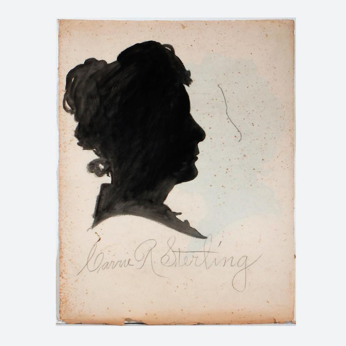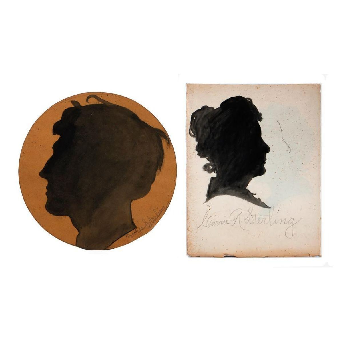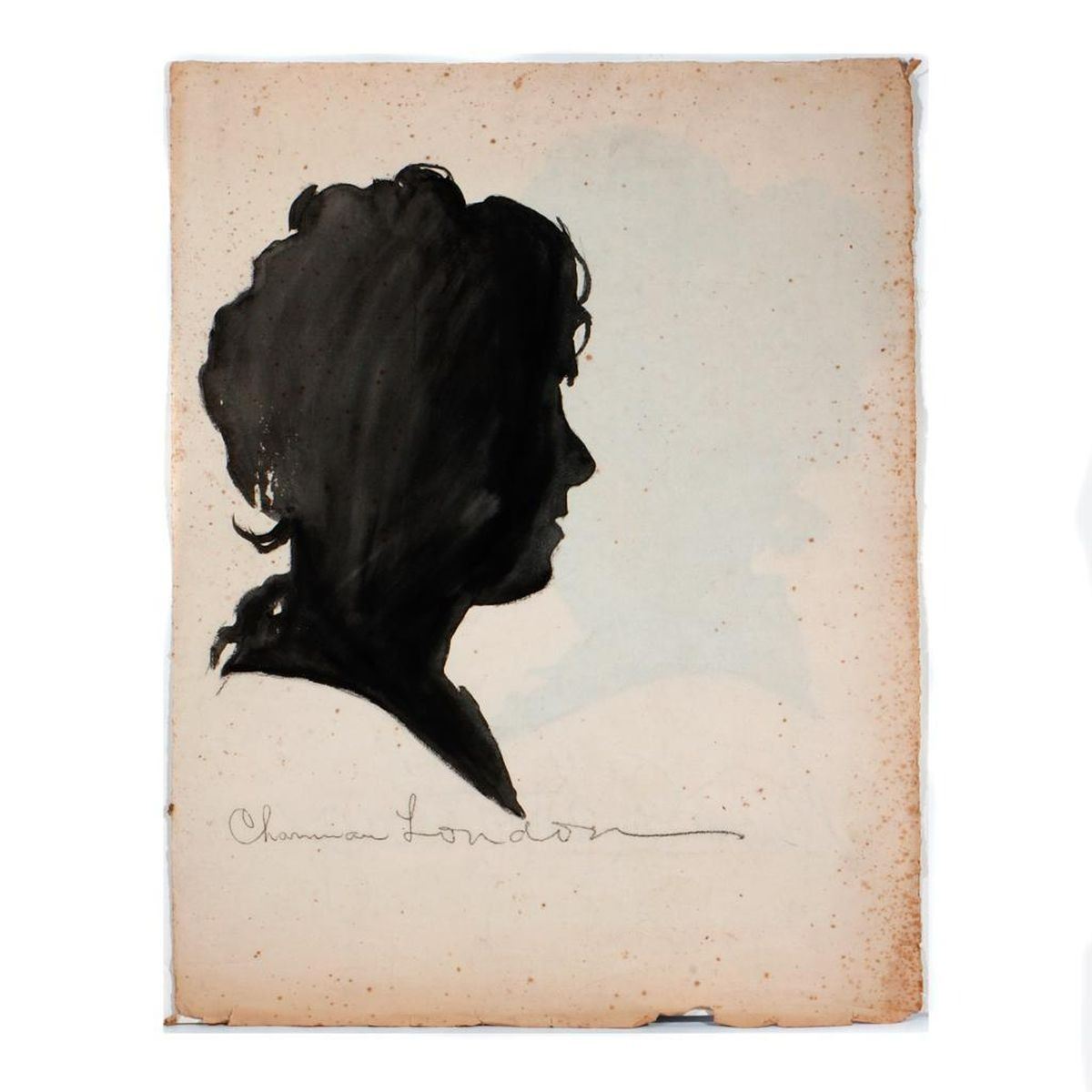Artist: Xavier Martinez (1869-1943). Title/Description: Large silhouettes: George Sterling; and Carrie Sterling, with Charmian London verso (3 works on two sheets of paper). Signature: Unsigned. Date Created: c. 1900s-1910s. Medium/Ground: Charcoal/watercolor wash on paper. Size: 16in diam; and 24 1/2in x 19in. Condition: Sterling with some fading, pinholes at margins, some waviness to the paper at perimeter. London with foxing, toning, edge tears/losses. Charmian Kittredge London (1871-1955). London was a writer, outdoorswoman, and second wife of author Jack London. She grew up in Oakland, attended Mills College, and was a part of the local artistic, literary, and intellectual circles, which included Jack London, George Sterling, Xavier Martinez and other members of the Crowd. George Sterling (1869-1926). Sterling was a Bay Area and Carmel poet and playwright. He was mentored by Ambrose Bierce and Ina Coolbrith, and became a central member of the artistic and literary Crowd, along with his wife Caroline "Carrie" Rand Sterling, a group that included Xavier Martinez, Joaquin Miller, Gelette Burgess, James Hopper, Henry A. Lafler, and Perry H. Newberry. He became a pivotal member of the Bohemian Club, on the premises of which he eventually took his own life. Sterling is known for describing San Francisco in his poem on the city as "the cool, grey city of love". From the Family of Xavier Martinez (1869-1943), Elsie Whitaker Martinez (1890-1984), and Micaela Martinez DuCasse (1913-1989).