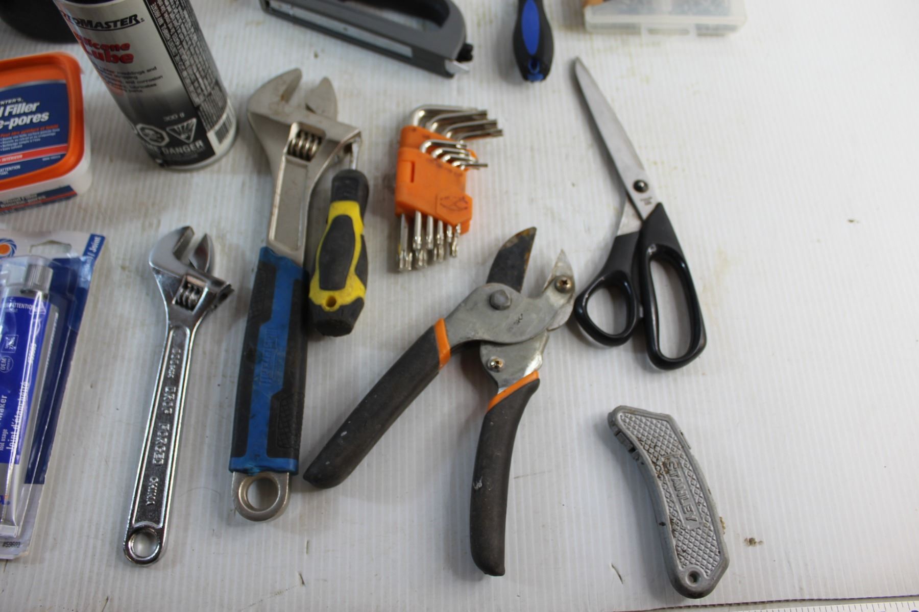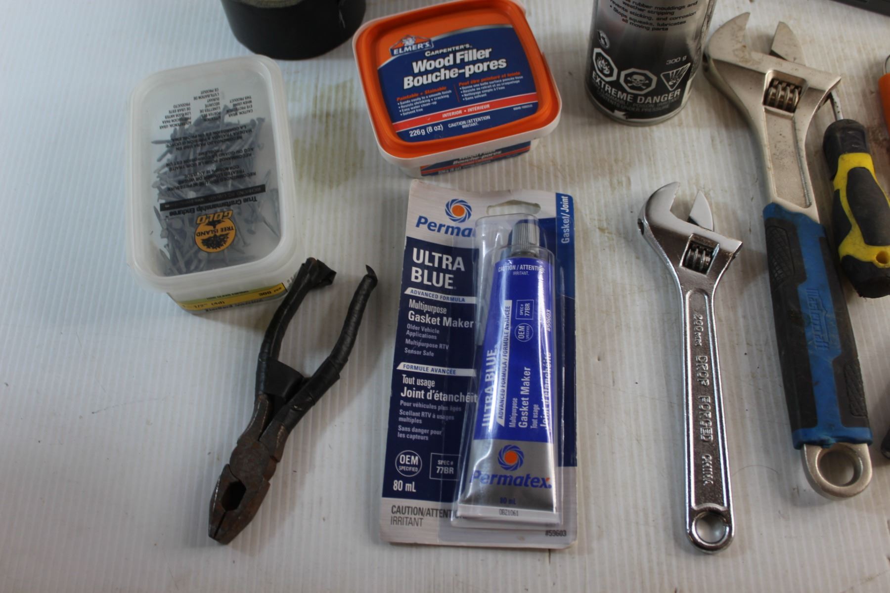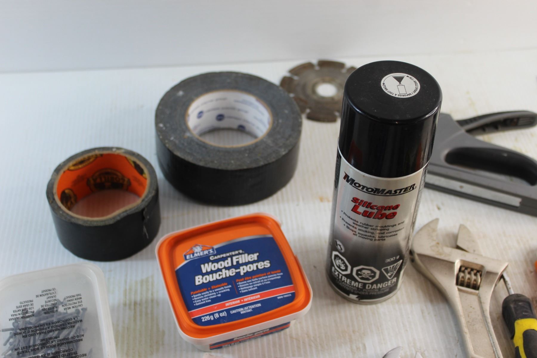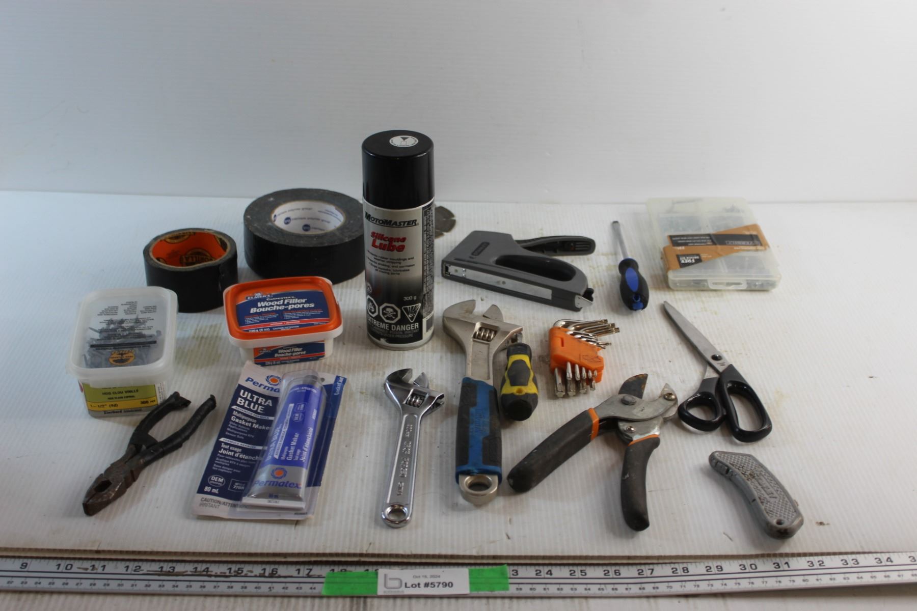 Silicone Lube, Adjustable Wrenches, Scissors, Stapler, Box Cutter and Assorted Items