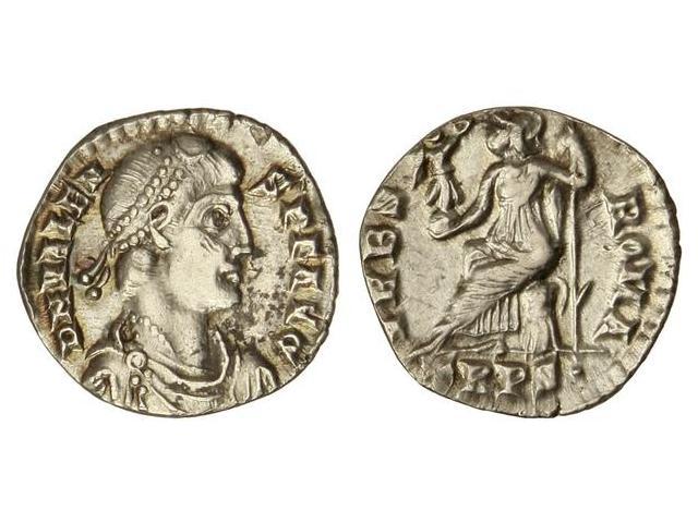 Silicua. Acuñada el 367-375 d.C. VALENTE. Anv.: D. N. VALENS. P. F. AVG. Busto a derecha con coraza y diadema. Rev.: VRBS ROMA TRPS. Roma sentada a izquierda con Victoria y cetro. AR. C-109. MBC+/MBC.