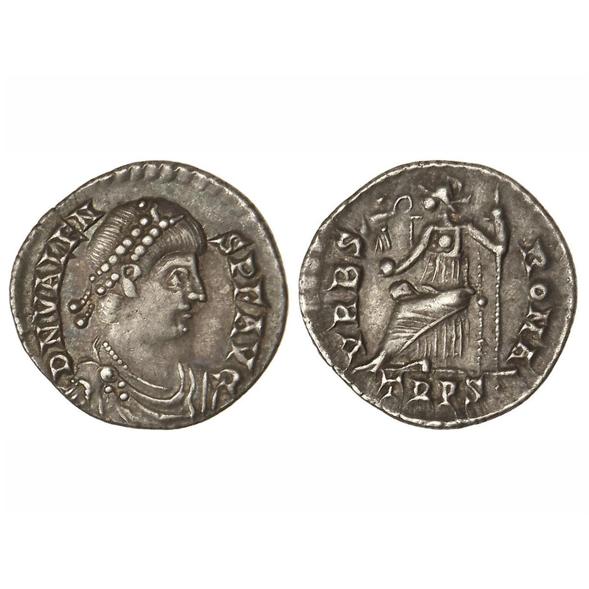 Silicua. - Acuñada el 367-375 d.C. - VALENTE. - Anv.: D. N. VALENS. P. F. AVG. Busto a derecha con diadema. Rev.: VRBS ROMA. En exergo: TRPS. Roma sentada a izquierda con Victoria y cetro. 2 grs. AR. C-109. MBC+. - -