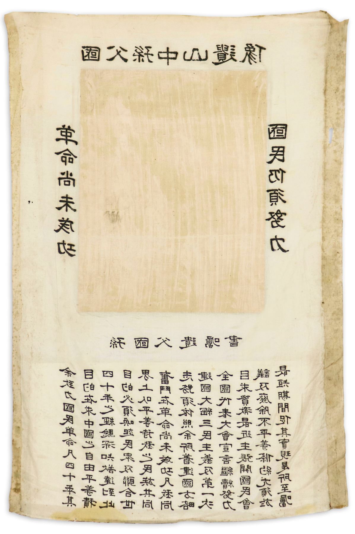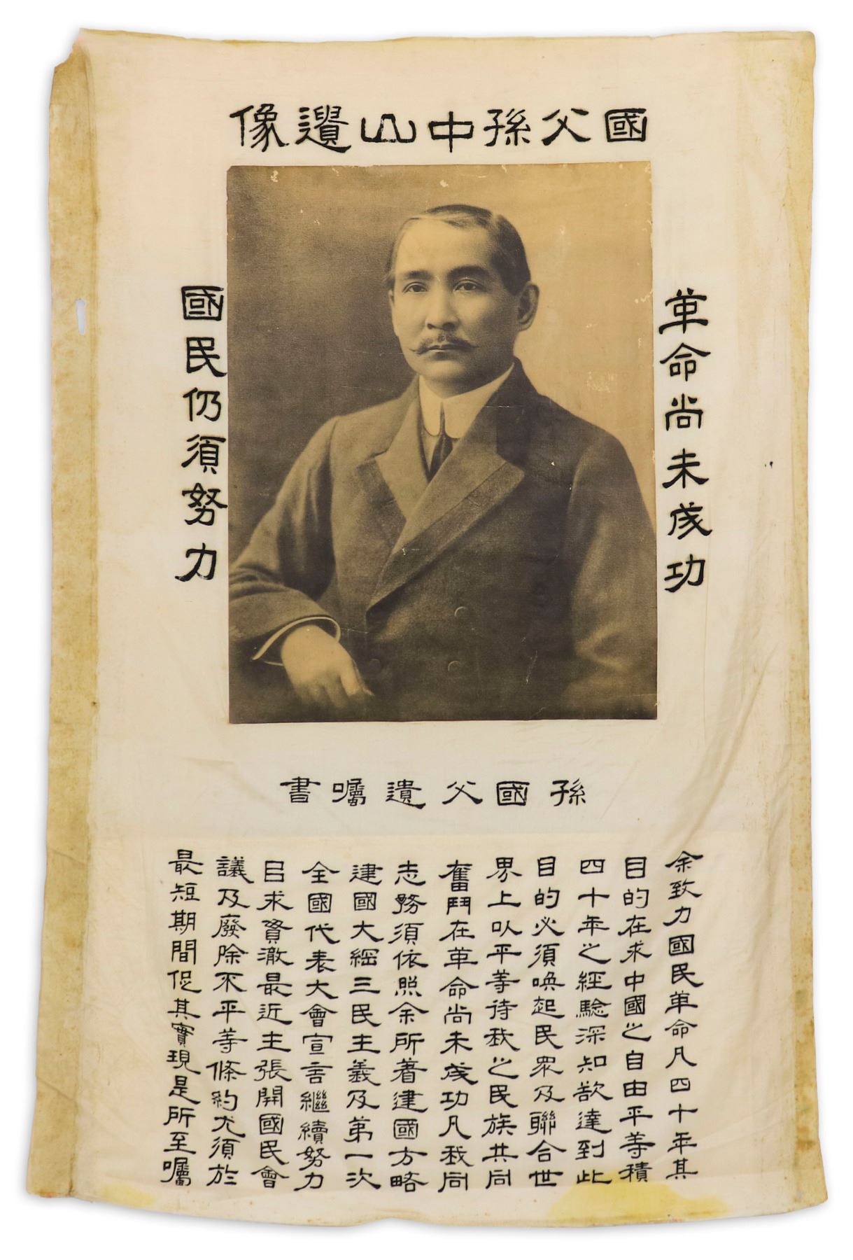 Large silk banner featuring a lithographic portrait of China's founding father Sun Yat-sen, produced in 1925 after his death to commemorate him. Portrait is laid down on the silk background, with black text printed directly on the silk. Banner measures 28.5'' x 43''. Some light soiling and holes, mostly confined to margins. Portrait has a few abrasions. Overall in very good condition, displaying beautifully.