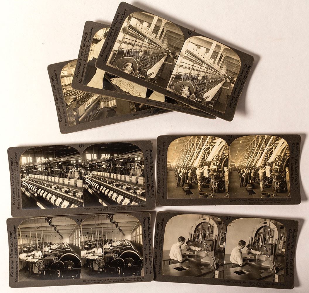 Lot of 7 different Keystone stereoviews. Includes: Doubling frame in large woolen mill, Lawrence, Massachusetts; weighing and sorting raw silk skeins in So. Manchester, Connecticut; spinning silk on roving frame, Manchester, CT; printing room of cotton mills in Lawrence; weaving ribbons in Paterson, New Jersey; cutting out boy's pants with band saw in New York; and straightening of fibers in silk factory in South Manchester. (Prag Collection) Date: Location: Connecticut HWAC # 54777