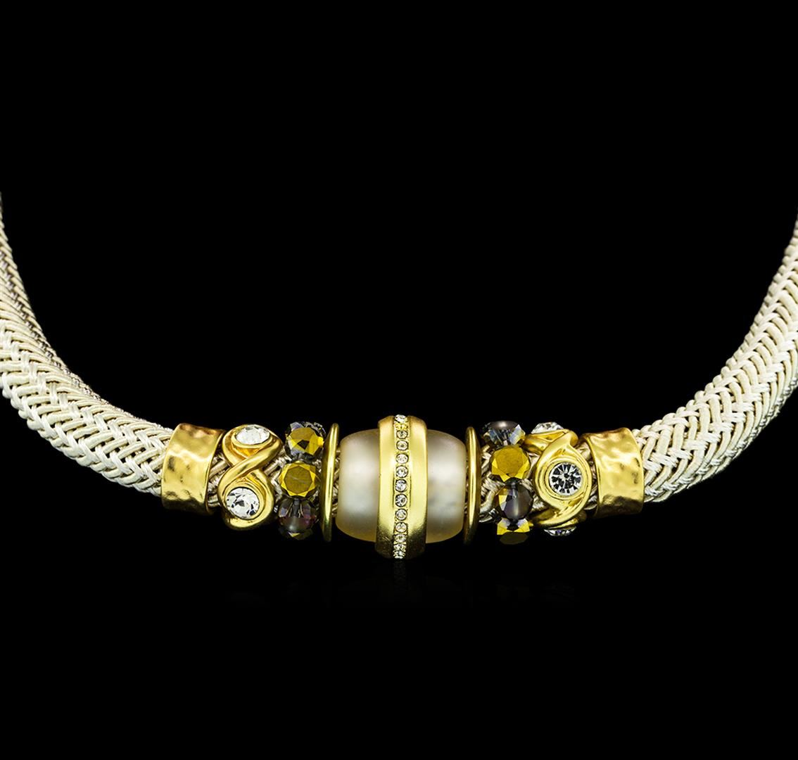 High end designer jewelry. Silk Crystal Necklace - Gold Plated. Gold Plated Clasp. Nude/ Gold. Short. Total Weight: 50 grams.