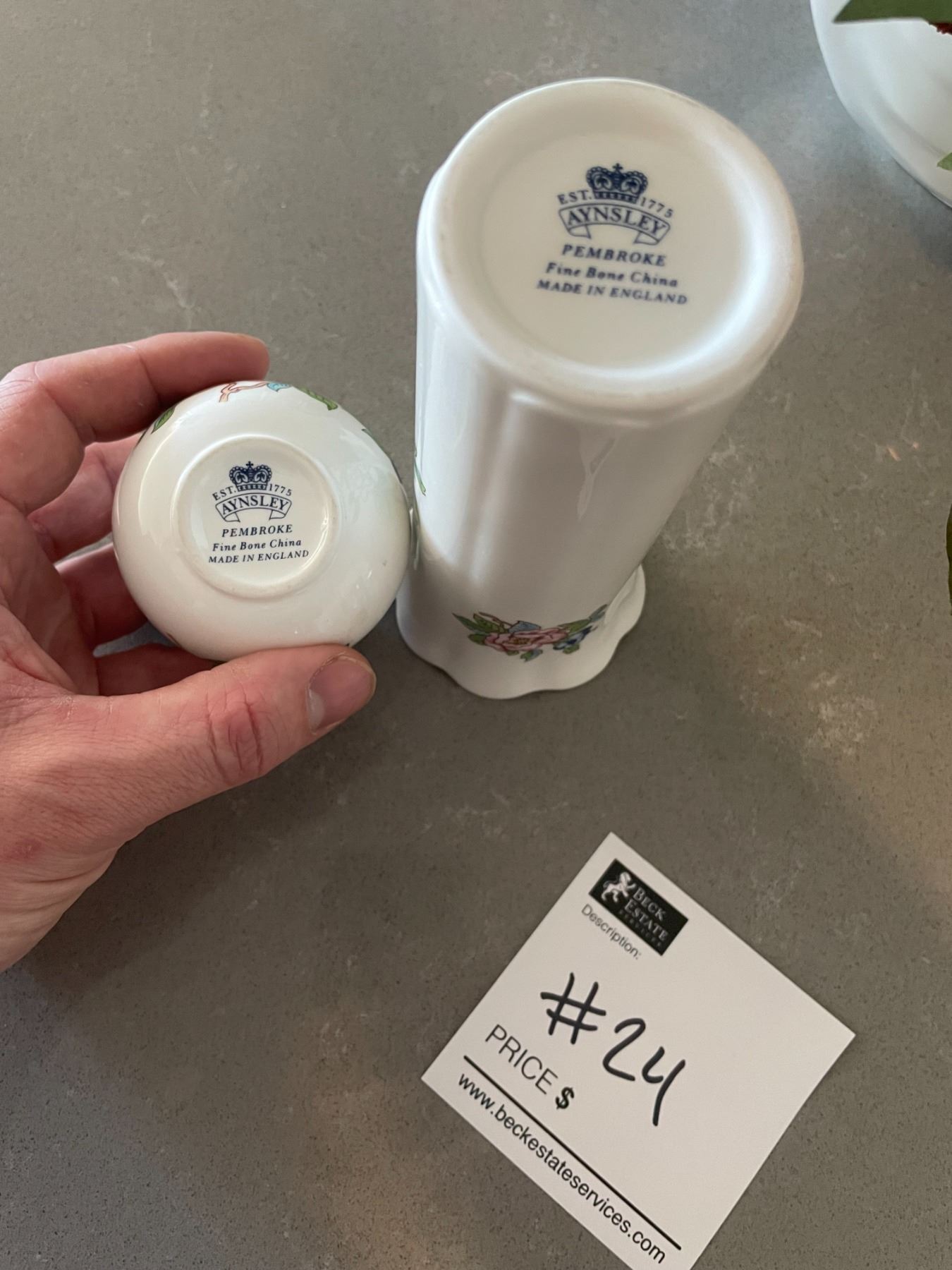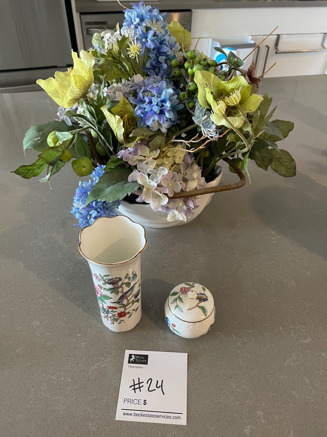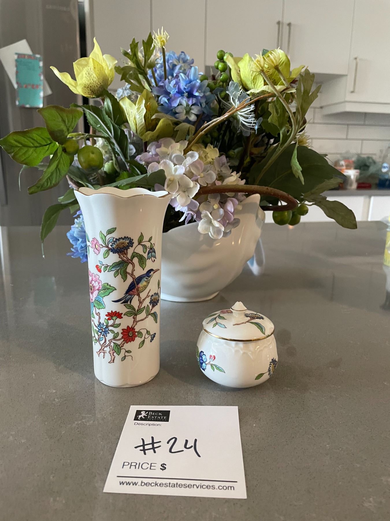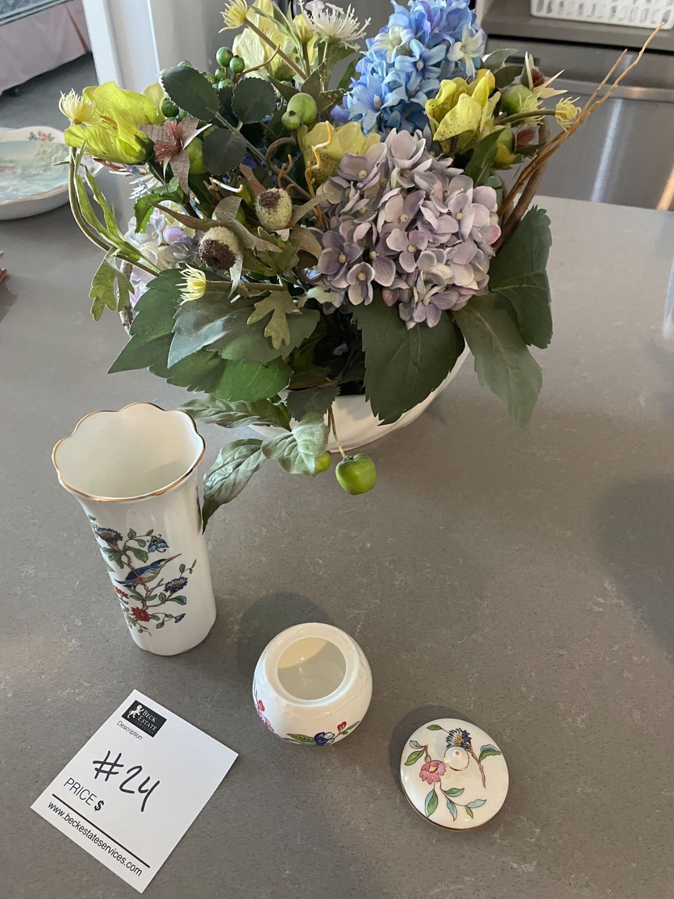Silk Floral Arrangement in a Aynsley Bone China Vase with Trinket Jar & Plate