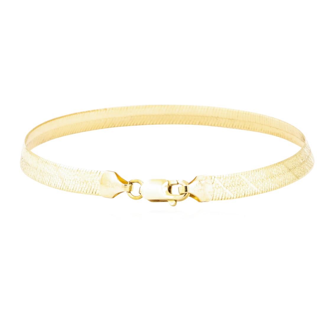 One silk herringbone chain bracelet measuring approximately eight inches in length and 5mm in width featuring: an engraved pattern 14KT yellow gold weighing 5.2 grams.