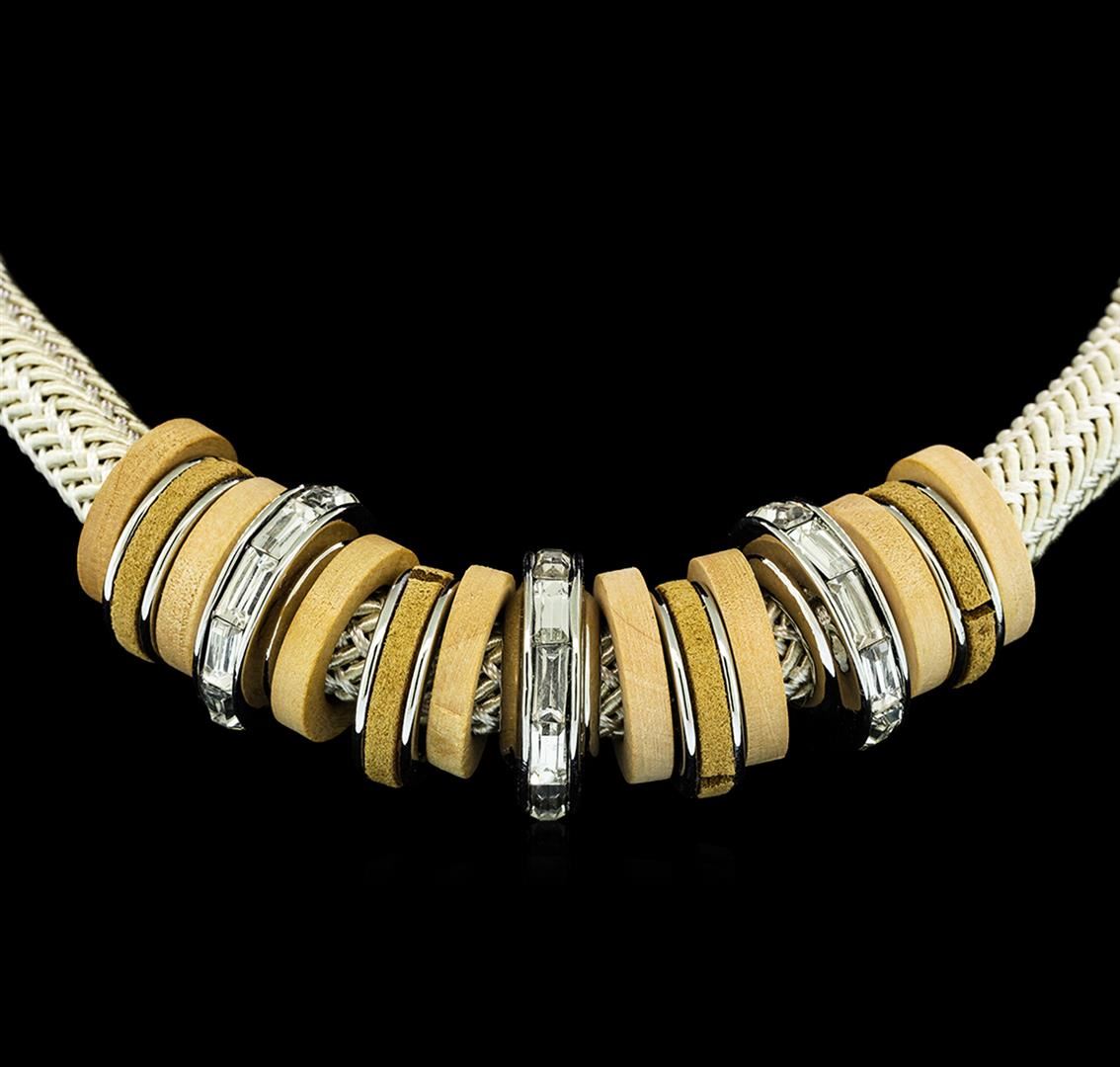 High end designer jewelry. Silk Macrame Necklace - Rhodium Plated. Rhodium Plated Clasp. Nude/ Silver. Short. Total Weight: 75.5 grams.