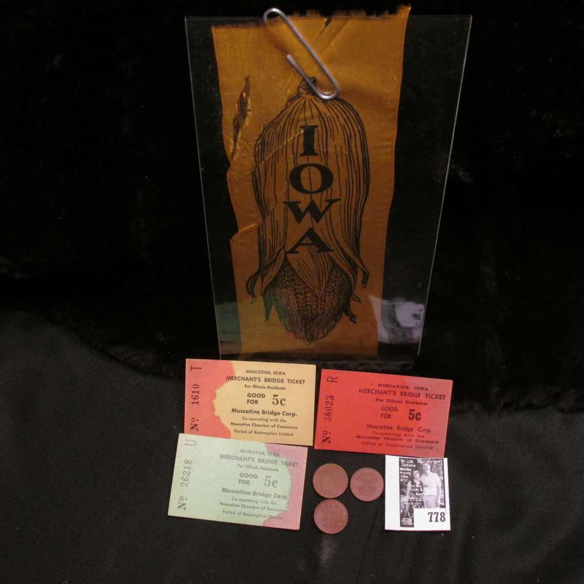 Silk Ribbon "Iowa" depicts an ear of Corn; group of (3) Fiber Pool Hall Tokens; & (3) different Muscatine, Iowa Bridge Tickets.