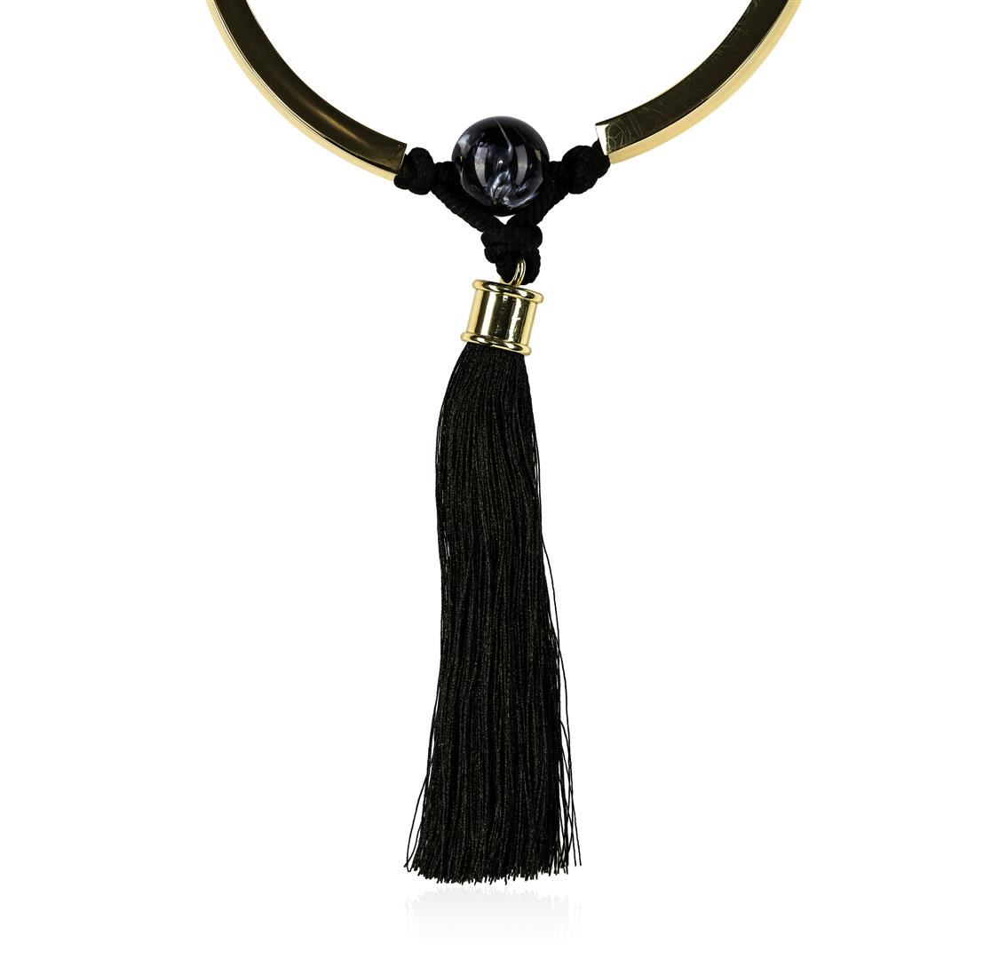 High end designer jewelry. Silk Tassel Pendant Necklace - Rhodium Plated. Gold Plated Metal/3.5" Ext Clasp. Black/ Gold. 20/8inches. Total Weight: 116 grams.