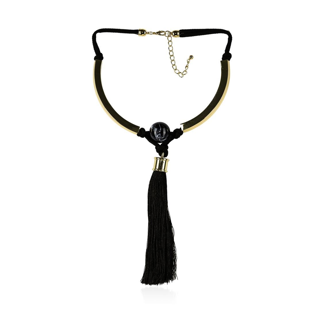 High end designer jewelry. Silk Tassel Pendant Necklace - Rhodium Plated. Gold Plated Metal/3.5" Ext Clasp. Black/ Gold. 20/8inches. Total Weight: 116 grams.