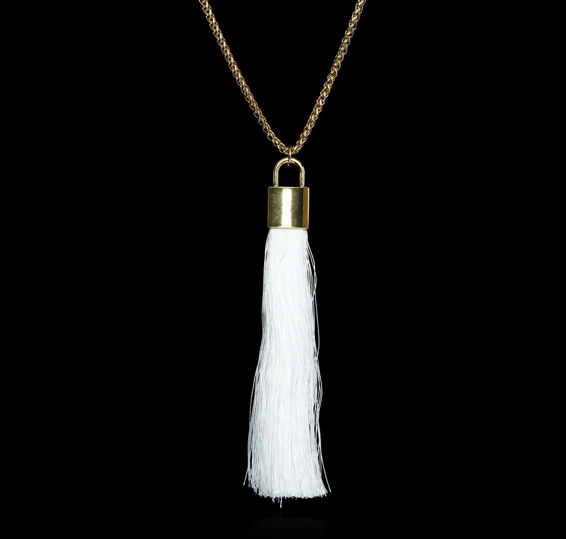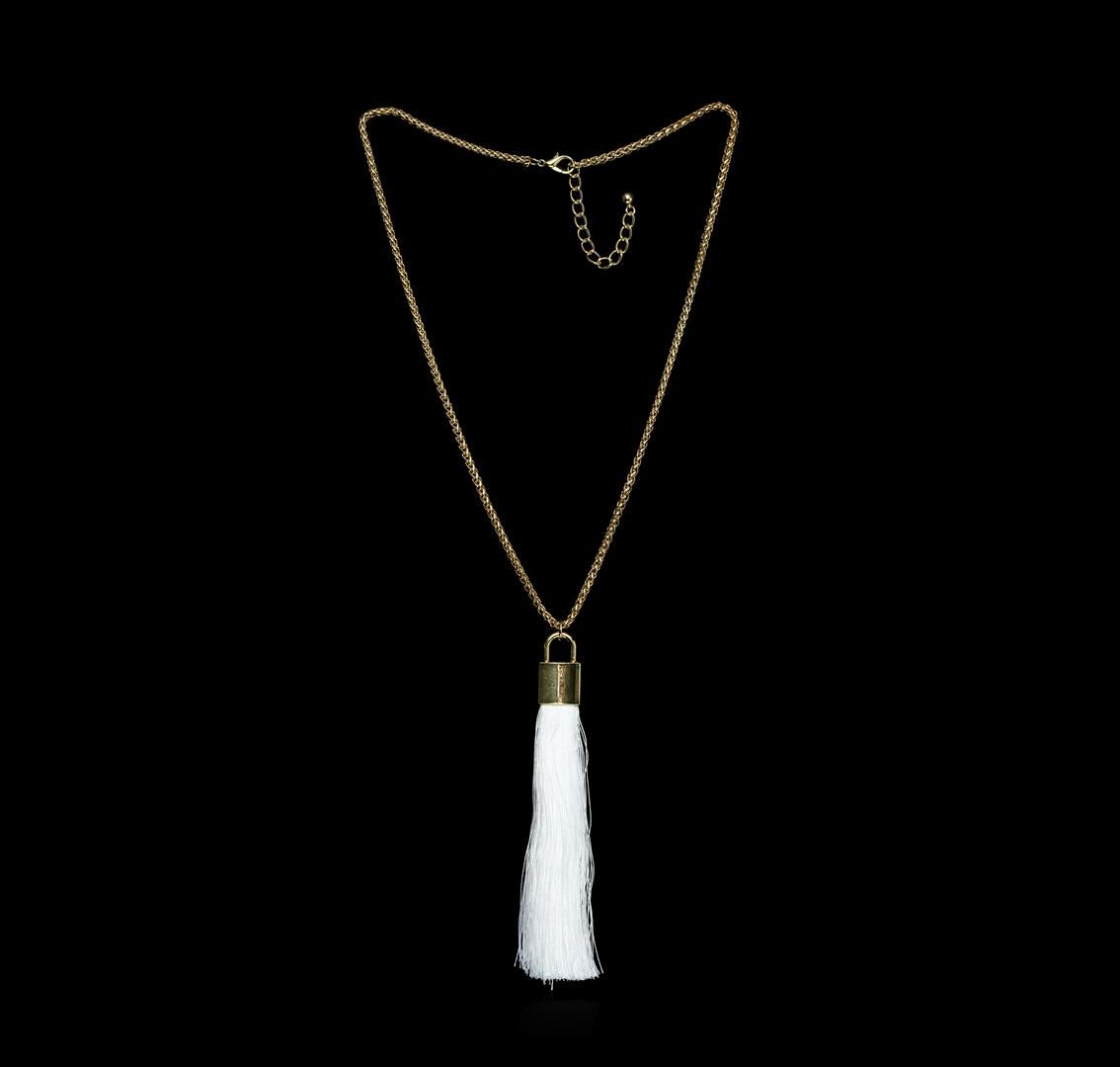 High end designer jewelry. Silk Tassel Square Pendant Necklace - Gold Plated. Gold Plated Metal/3" Ext Clasp. White/gold. 28/6inches. Total Weight: 60.3 grams.