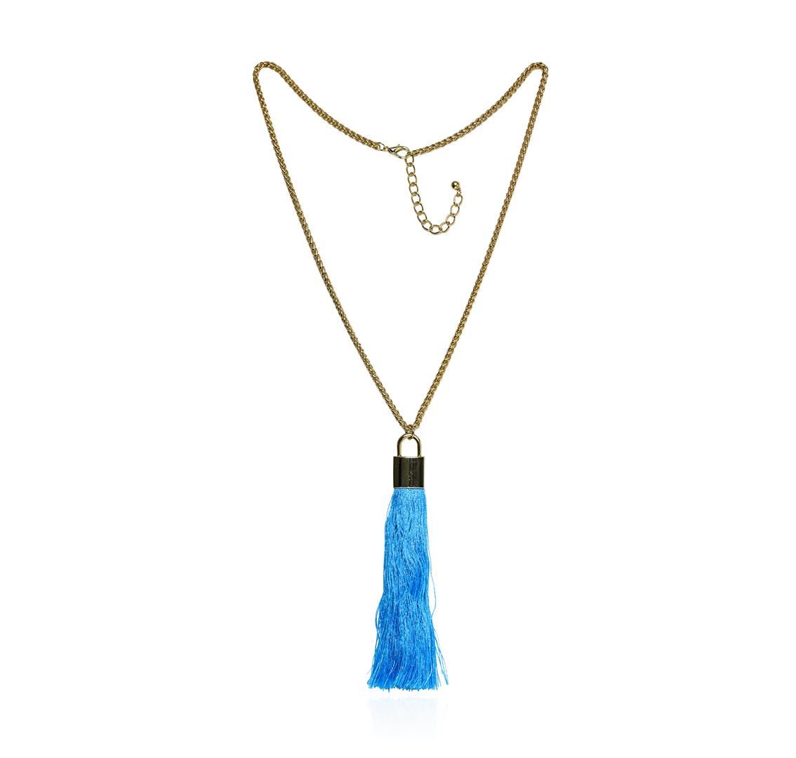 High end designer jewelry. Silk Tassel Square Pendant Necklace - Gold Plated. Gold Plated Metal/3" Ext Clasp. Blue/ Gold. 28/6inches. Total Weight: 60.6 grams.
