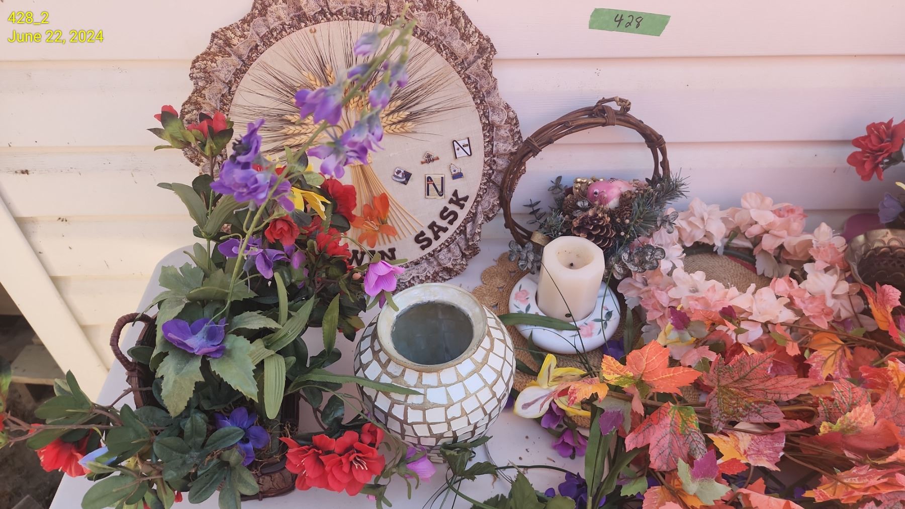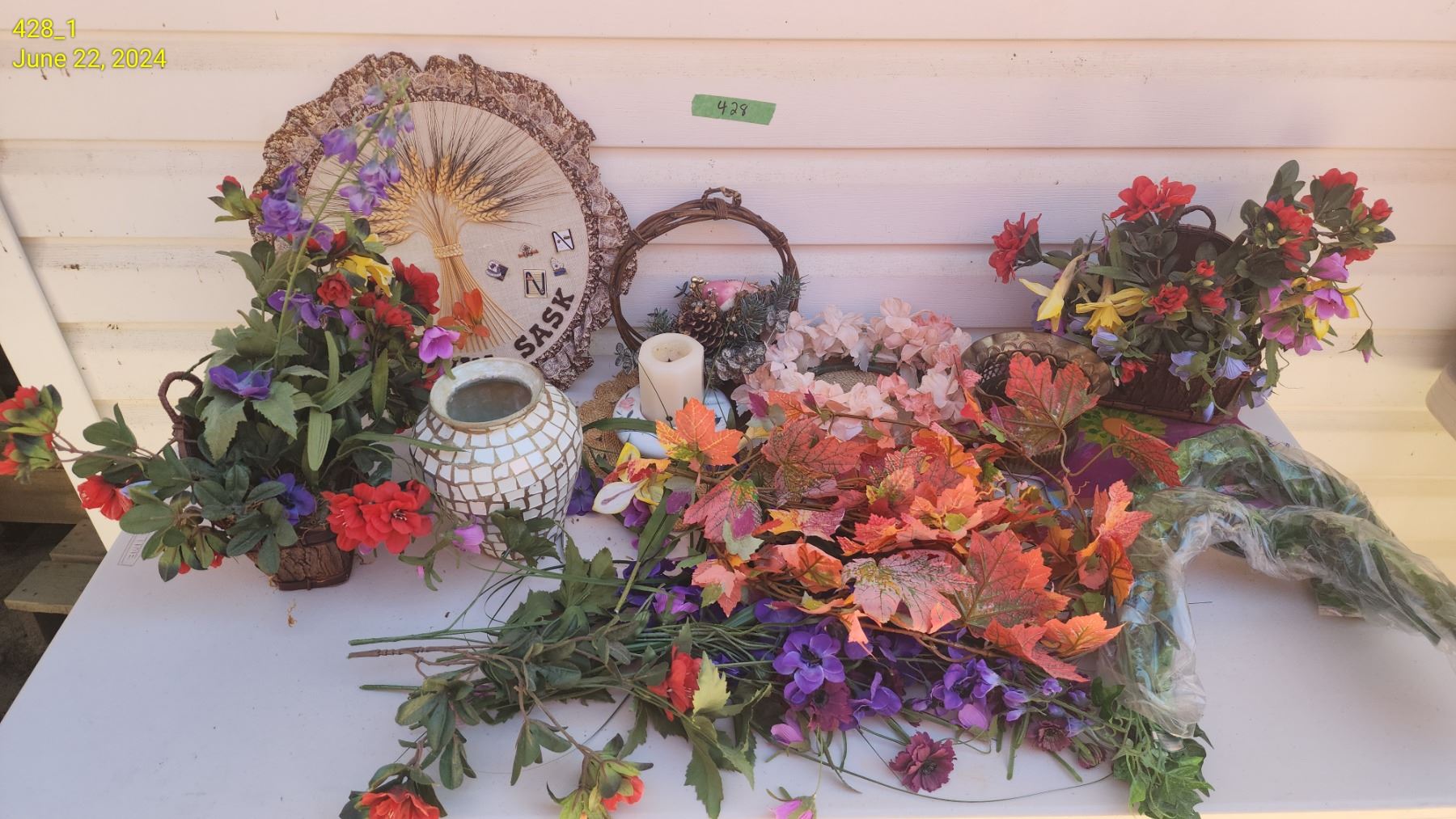 Silk and Plastic Artificial Flowers, Vase, and misc.