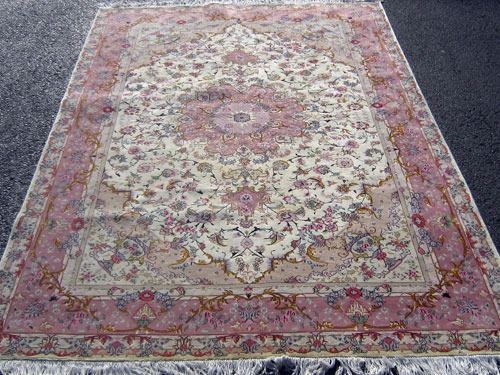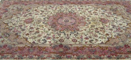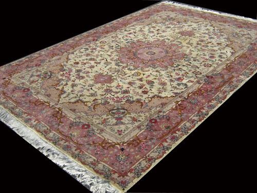 Amazingly gorgeous super fine part silk Persian Tabriz rug. 100%natural, hand woven, vegetable dye, pure silk and highest quality baby lamb's wool pile on pure silk foundation. this is a remarkable floral Tabriz design with an endearing arabesque pattern and a captivating central medallion with elegant tear drops on a soft toned beige background. it is a given in the rug industry, that rugs with silk foundations are of finer quality due to the resiliency of the silk as oppose to cotton which is typically used in rug weaving. Therefore, the use of pure silk foundation is representative of the fact that this rug is of superior quality. Please notice how artistically the design flows freely within the primary and secondary borders, as if, the artist does not allow the border lines to limit his imagination. this lovely piece is painstakingly and masterfully hand woven, knot by knot, and has about 300 knots per square inch. it takes a master weaver over four years to weave and bring this beauty to life. Where a typical Persian rug is limited to a range of twelve and sixteen colors, this captivating piece features more than forty-two different colors, creating a beautiful tapestry of colors that are feast for the eyes. Spirited uncompromising workmanship, sublime color palette and durable construction have made Tabriz rug of choice for many centuries. Tabriz is located in the northwestern part of Iran and is the birthplace of some of the most talented master weavers in Iran. The leather band sewn on the edge on the back of this rug is to prevent the edges from curling under due to the extreme tightness of the weave. Size: 10 feet X 6 feet 7 inches. Country of Origin: Iran.