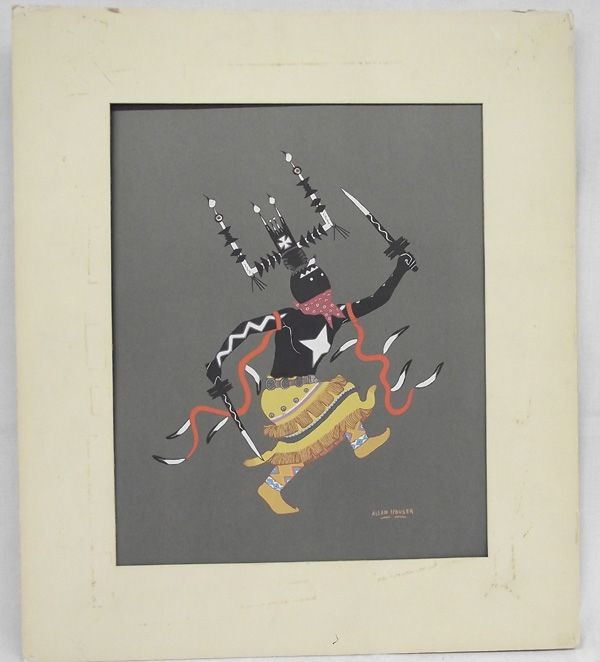 Silkscreen Print Native American Apache Gan Dancer - Allan Houser. This print measures 12''x9.75'' It is mounted on poster board, under a mat that has age wear and some stains. Born on June 30, 1914, Allan C. Haozous was to become known as Allan Houser, one of the 20th Century's most important artists. Allan's parents, Sam and Blossom Haozous were members of the Chiricahua Apache tribe who were held as prisoners of war for 27 years. In 1934 a notice for an art school in Santa Fe attracted Allan's attention, and he enrolled in the Painting School at the Santa Fe Indian School. Commonly known as the Dorothy Dunn School after its prominent teacher, Allan became its most famous student and by 1939 his work was exhibited in San Francisco, Washington D. C., and Chicago. In 1951 Allan moved to Brigham City, Utah, where he taught art at the Inter-Mountain Indian School for the next eleven years. In 1962 Allan was asked to join the faculty of the newly created Institute of American Indian Arts in Santa Fe. In 1975 Allan retired from teaching to devote himself full-time to his own work. In the two following decades he would produce close to 1,000 sculptures in stone, wood, and bronze, and emerged as a major figure on an international scale. He had nearly 50 solo exhibitions in museums and galleries in the United States, Europe, and Asia, and he continued working tirelessly until his death on August 22, 1994.