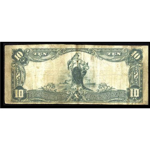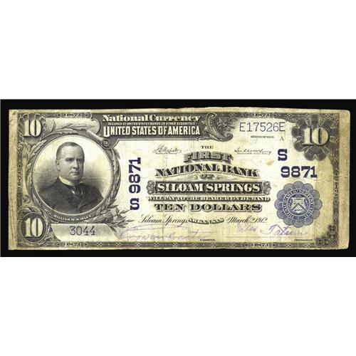 <B>Siloam Springs, AR</B></I> - $10 1902 Plain Back Fr. 628 <B>The First NB</B></I> Ch. # (S)9871<BR>This newly discovered example turned up in a small cash hoard which is seeing the light of day for the first time in this sale. It comes from by far the scarcer of Siloam Springs' two issuers, with this institution departing in 1929 after circulating large notes only. <B>Fine,</B></I> with violet signatures.