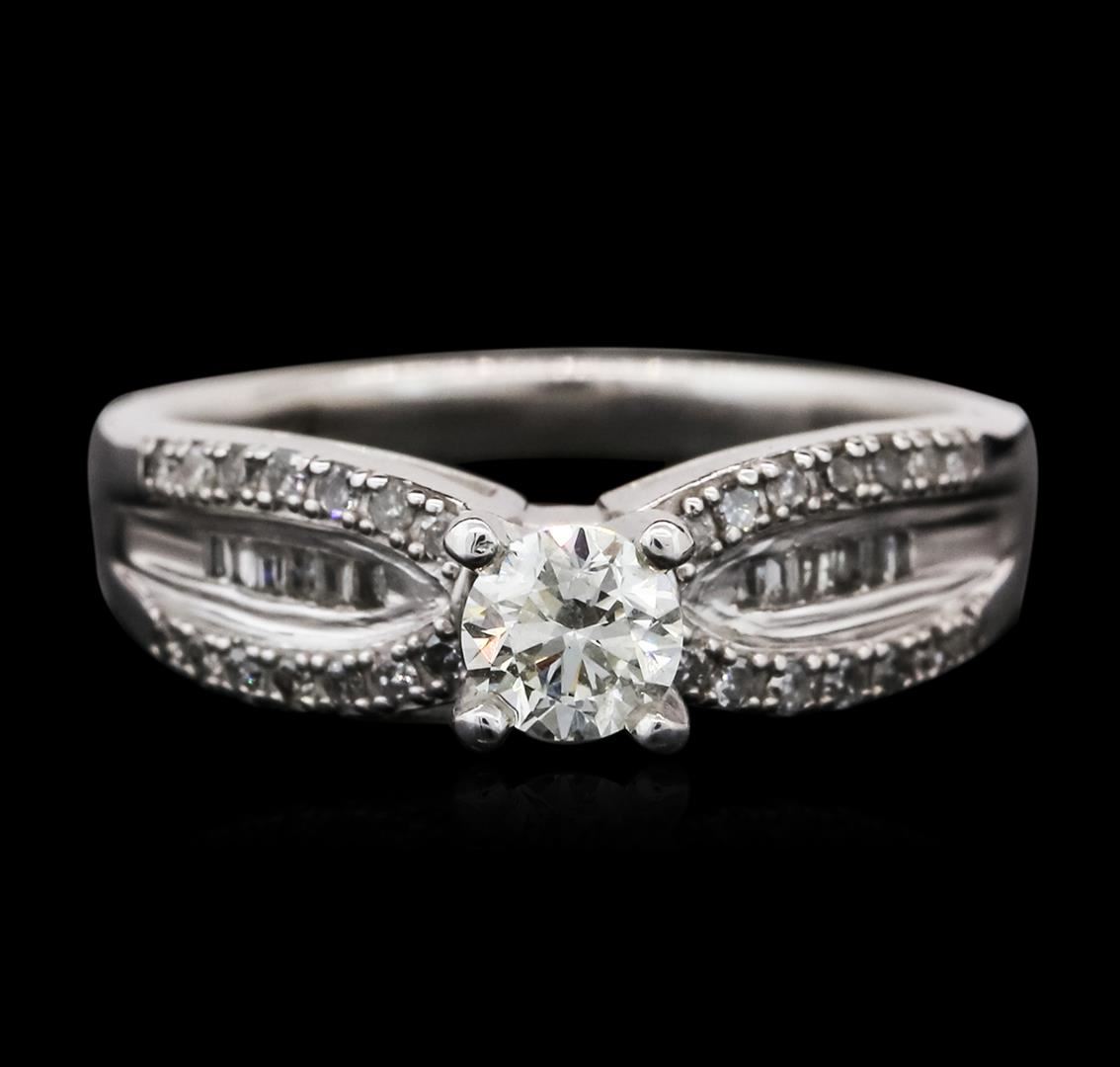 One ring featuring: Silver weighing 4.20 grams containing one prong set round cut diamond center stone with a total weight of 0.45ct and diamond side stones with a total weight of 0.30cts.