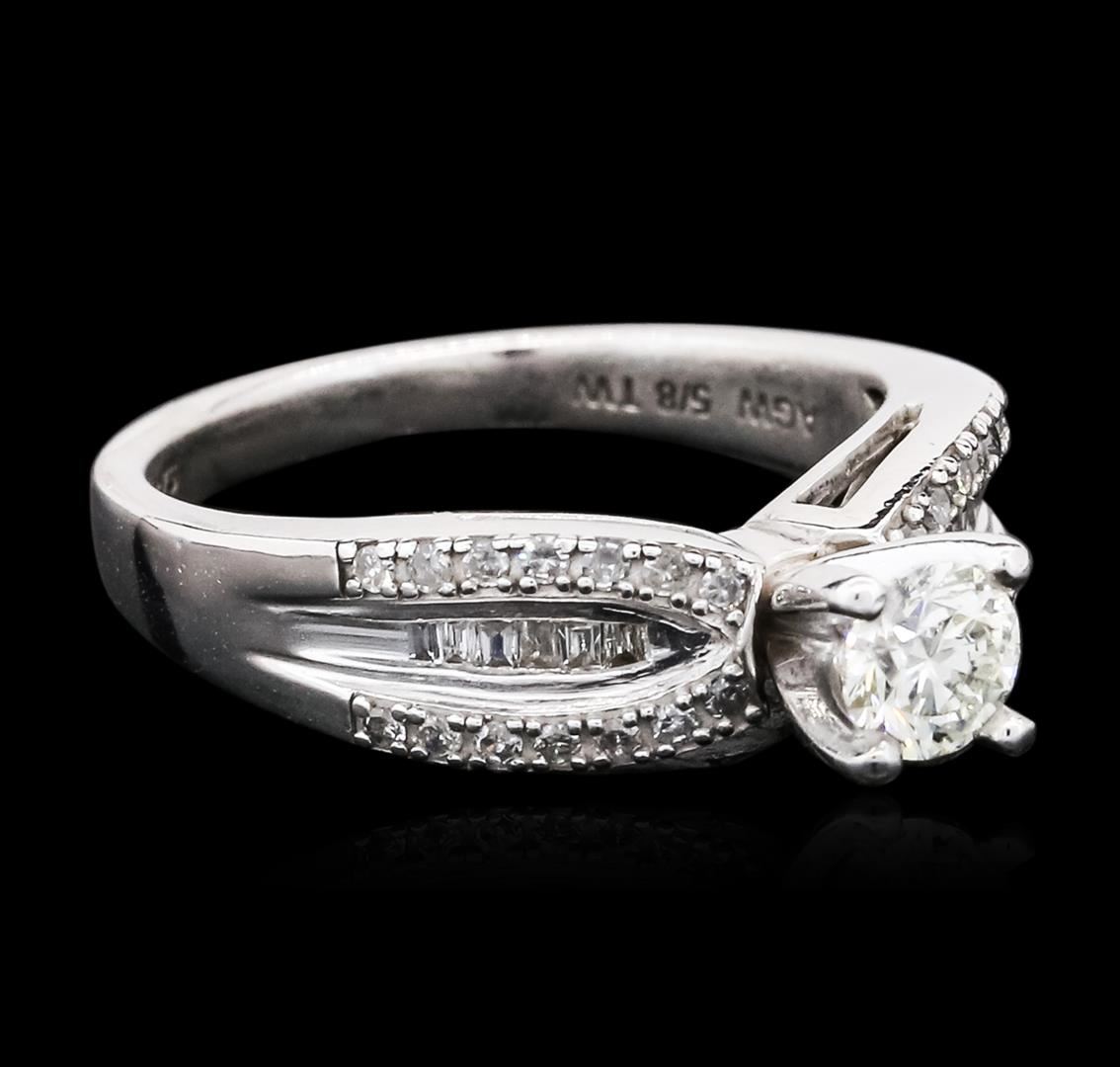 One ring featuring: Silver weighing 4.20 grams containing one prong set round cut diamond center stone with a total weight of 0.45ct and diamond side stones with a total weight of 0.30cts.