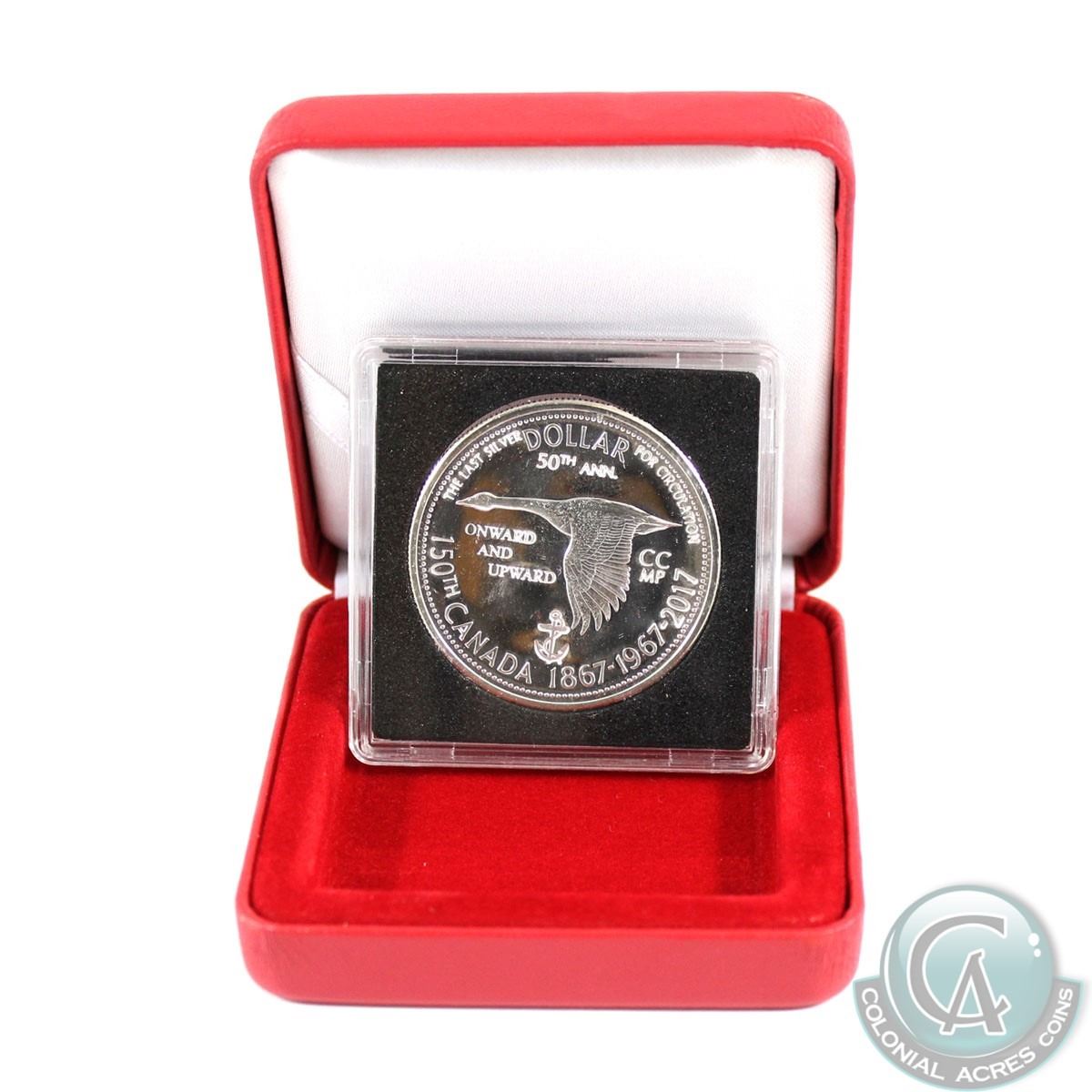 Silver $1 1867-1967-2017 Counter-Stamped Silver Dollar Commemorating the 150th Anniversary of Canada. This Counter-Stamped Dollar features an "Onward and Upward" with anchor Stamp and was issued by Citadel Coins. Limited mintage 200.