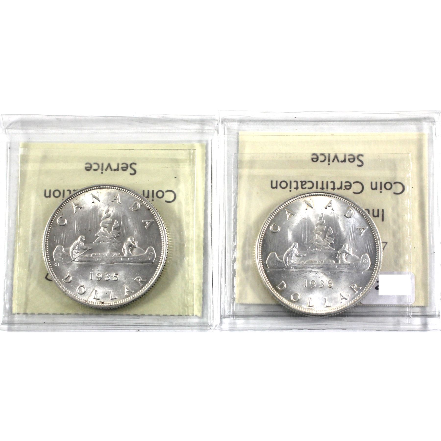 Silver $1 1935 & 1936 ICCS Certified MS-64. A choice lot of the only George 5th issue Silver Dollars. 2pcs