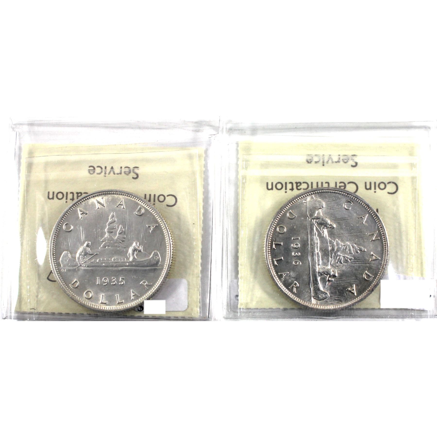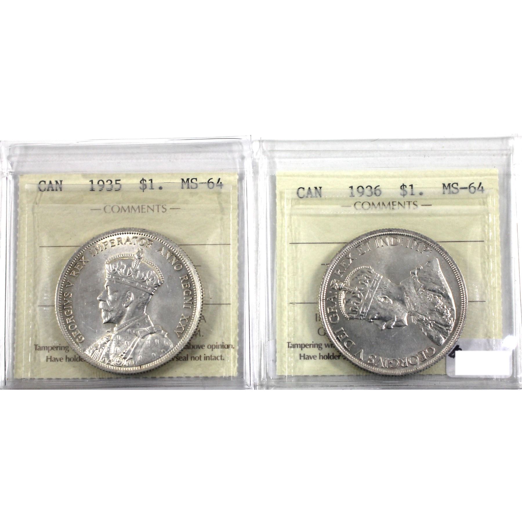 Silver $1 1935 & 1936 both ICCS Certified MS-64. Nice near full white coins for the first 2 year issues Silver Dollars. 2pc