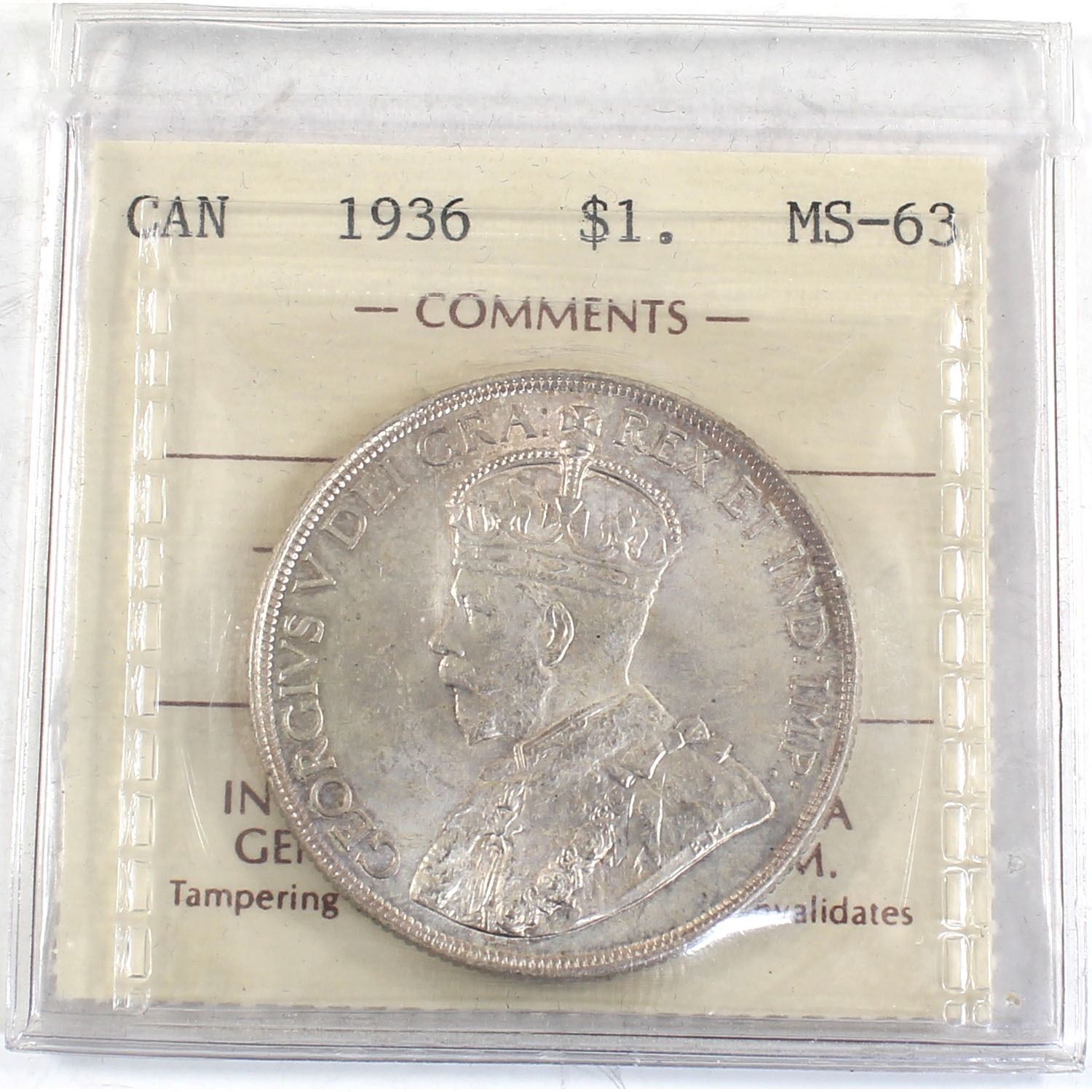 Silver $1 1936 ICCS Certified MS-63. Soft light tones throughout.