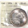Silver $1 1936 ICCS Certified MS65. attractive Light golden toning throughout both the Obverse and reverse over satin like fields.