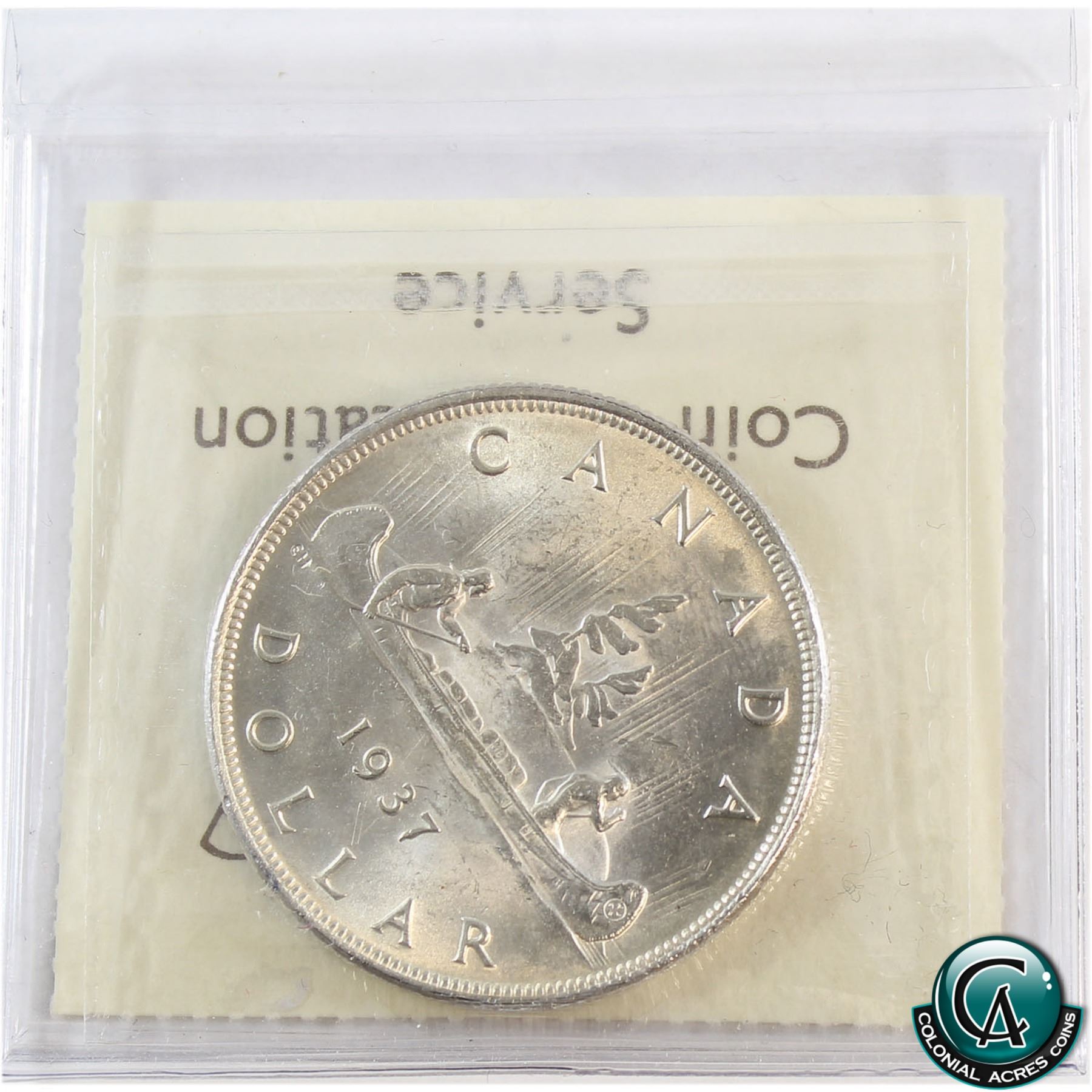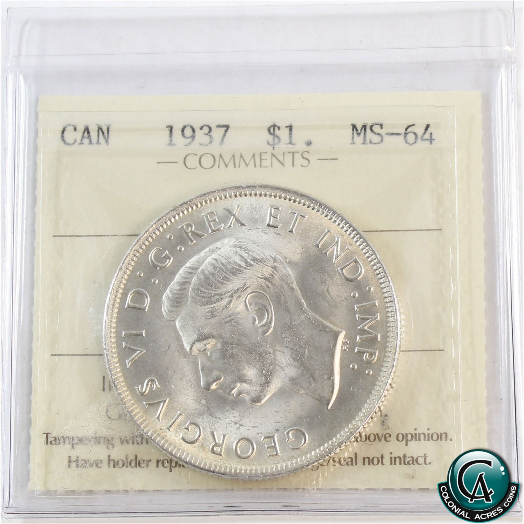 Silver $1 1937 ICCS Certified MS-64. A bright coin with soft hints of golden toning around the rim.