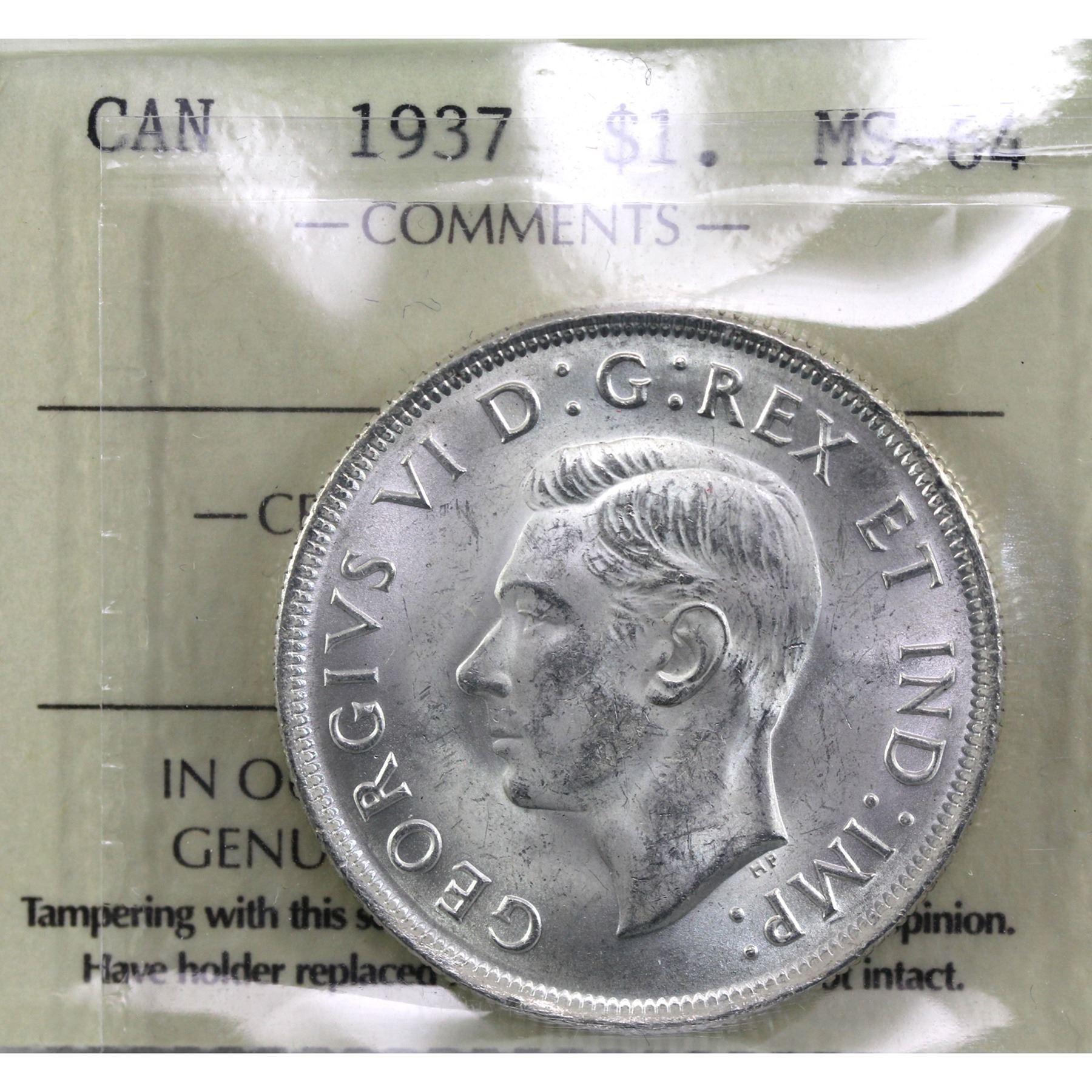 Silver $1 1937 ICCS Certified MS-64. A premium example coin with strong frosted mint bloom throughout the obverse and reverse. Choice eye appeal coin!