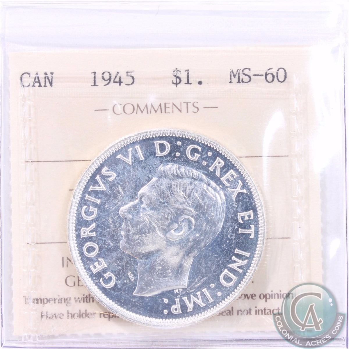 Silver $1 1945 ICCS Certified MS-60. A nice bright coin with an exceptional Reverse.