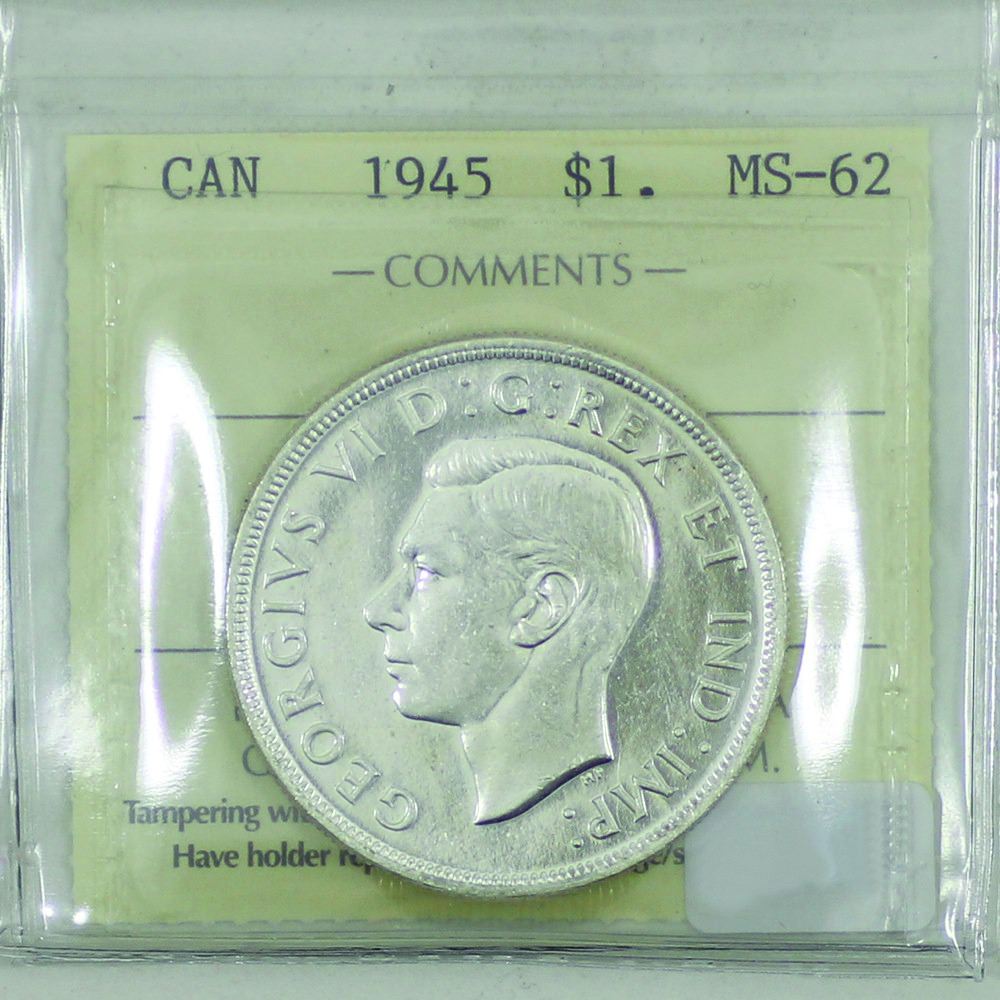Silver $1 1945 ICCS Certified MS-62. *KEY DATE* A nice clean coin with an exceptional reverse.