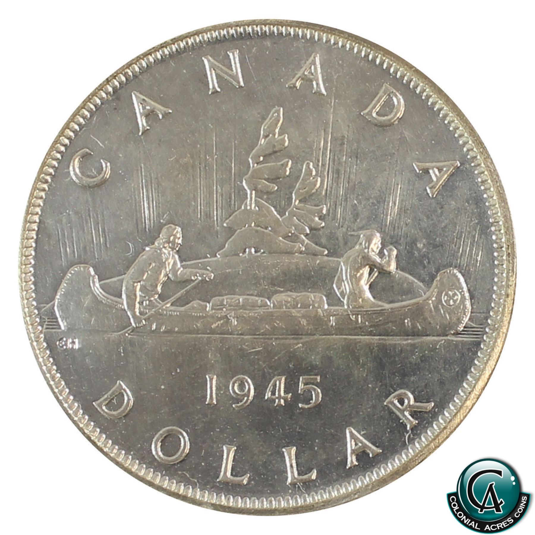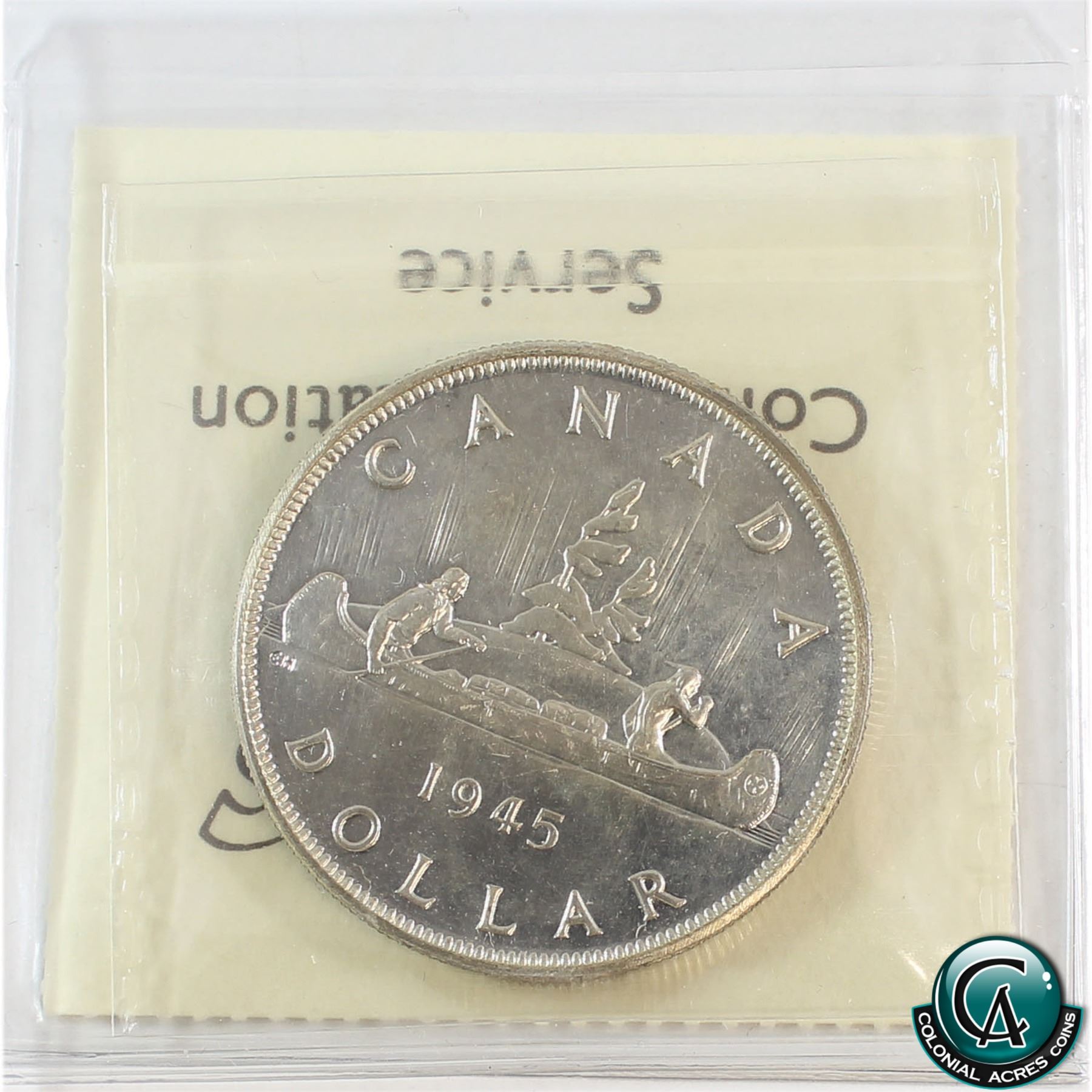 Silver $1 1945 ICCS Certified SP-64. Coin has a soft satin finish with subtle hints of golden toning.