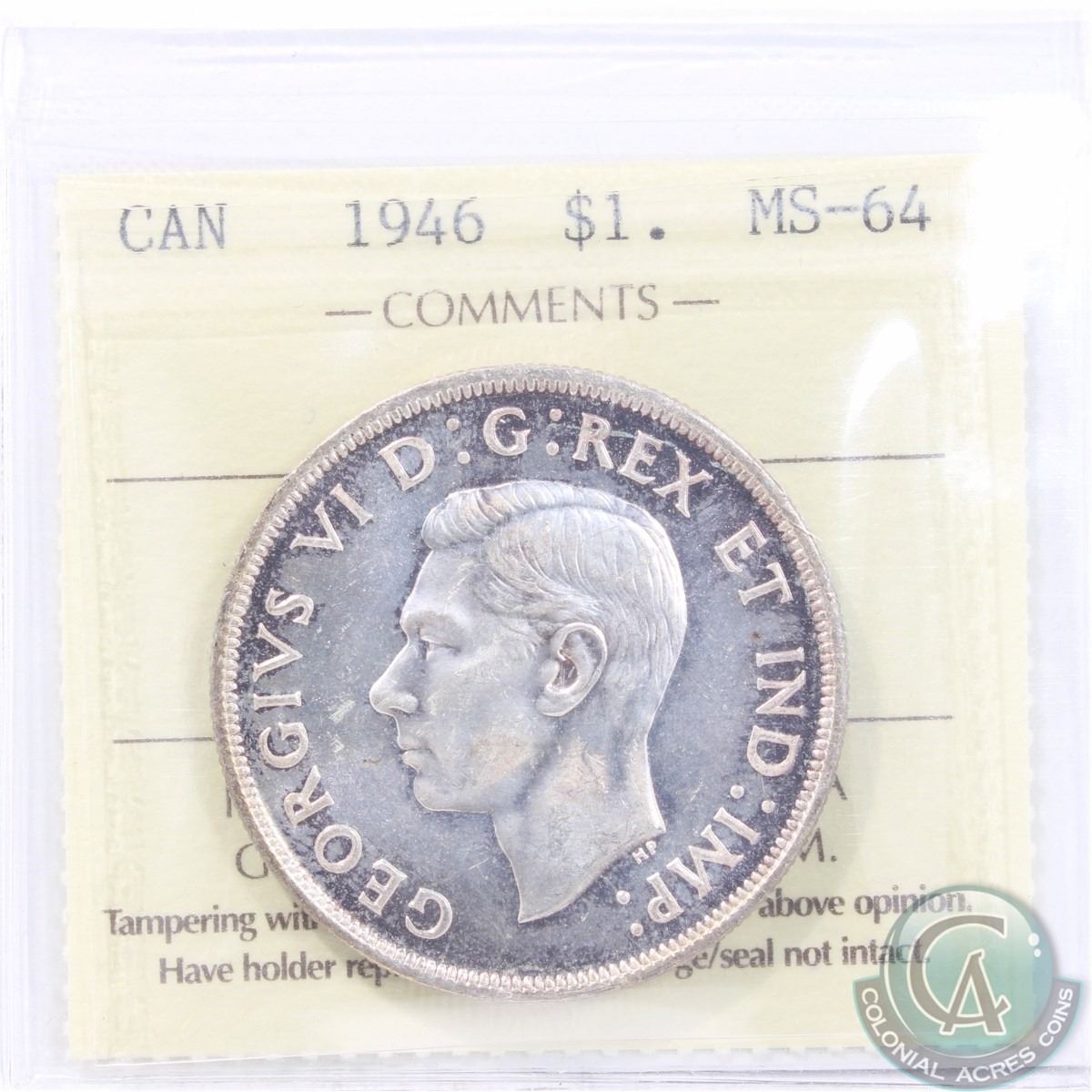 Silver $1 1946 ICCS Certified MS-64! Nice original coin with soft hints of purple and rose toning throughout accented by light cameo on the bust.