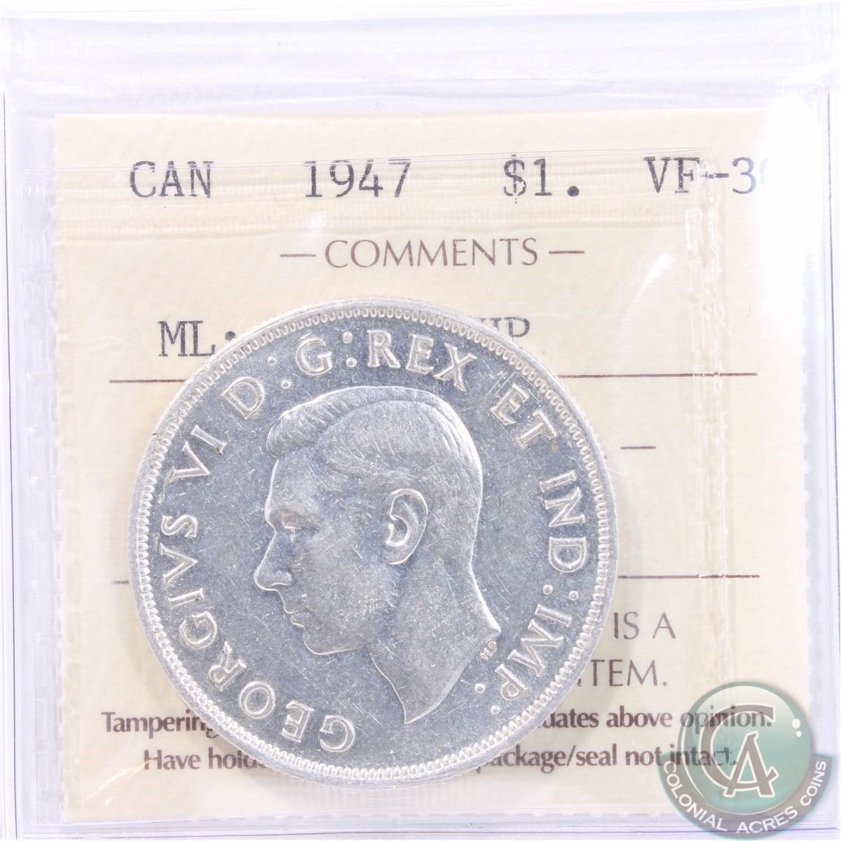 Silver $1 1947 Maple Leaf 2xHP ICCS Certified VF-30