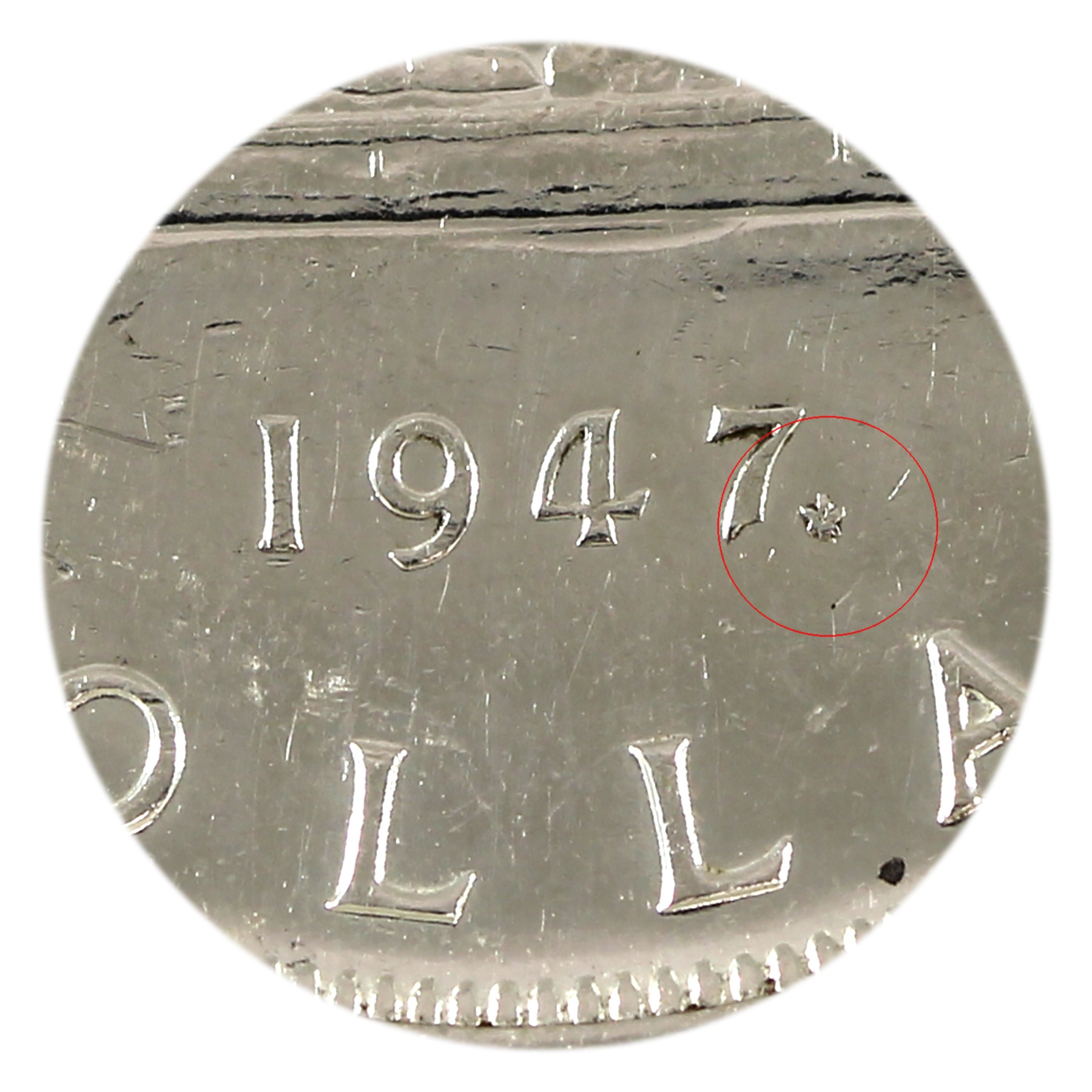 Silver $1 1947 Maple Leaf Double HP AU-UNC (Rubbed)
