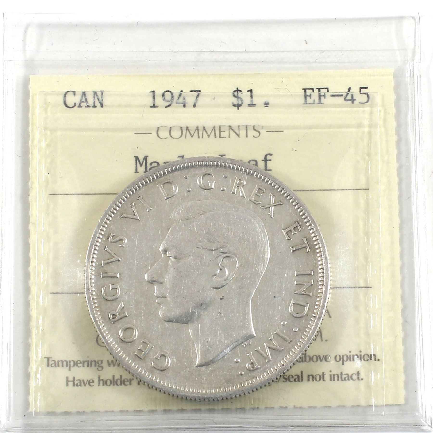 Silver $1 1947 Maple Leaf ICCS Certified EF-45. A great Problem free mid-grade coin.