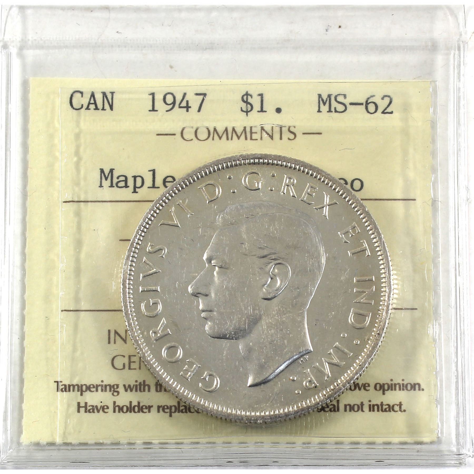 Silver $1 1947 Maple Leaf ICCS Certified MS-62 Cameo!