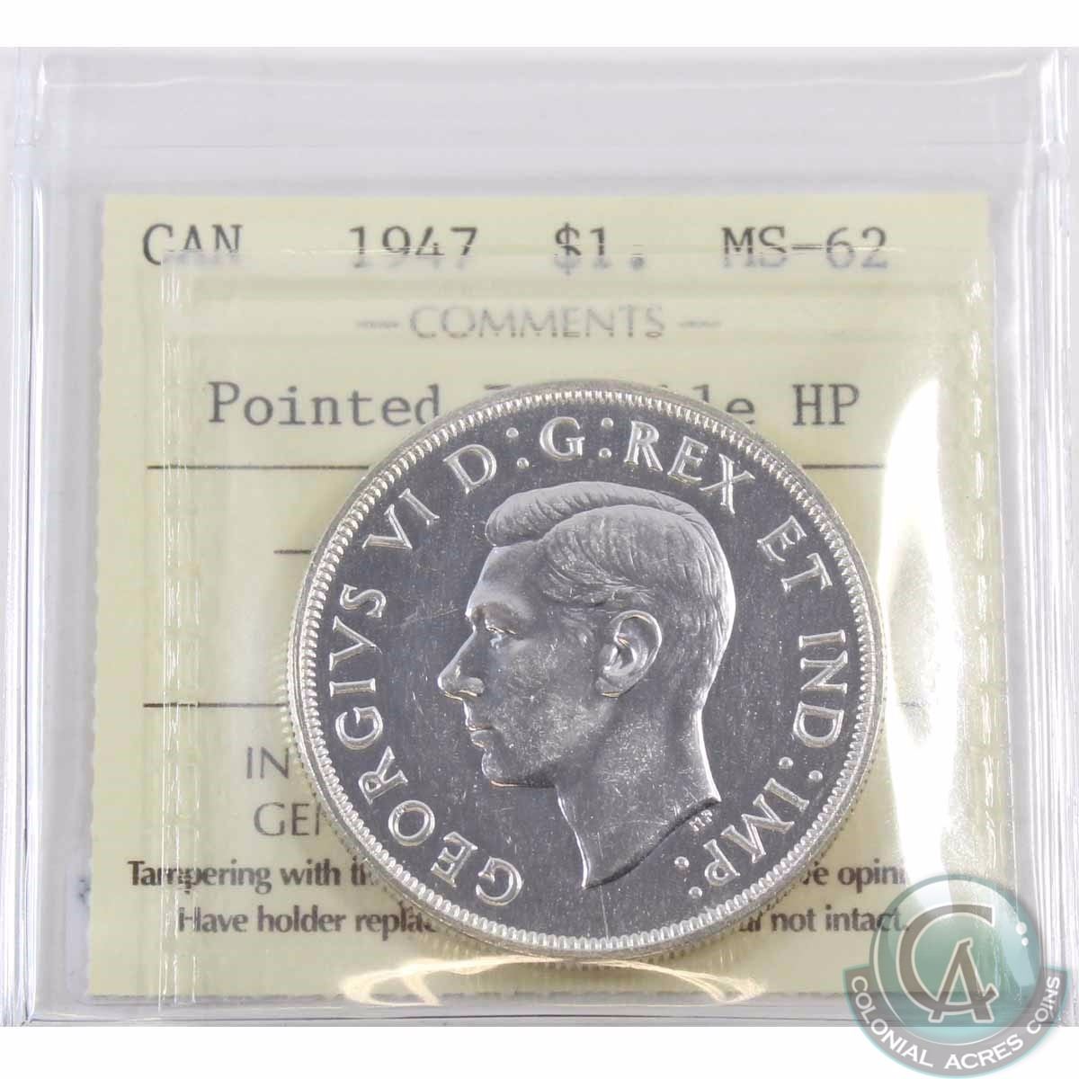 Silver $1 1947 Pointed 7 Double HP ICCS Certified MS-62. A nice clean coin with mirror fields.