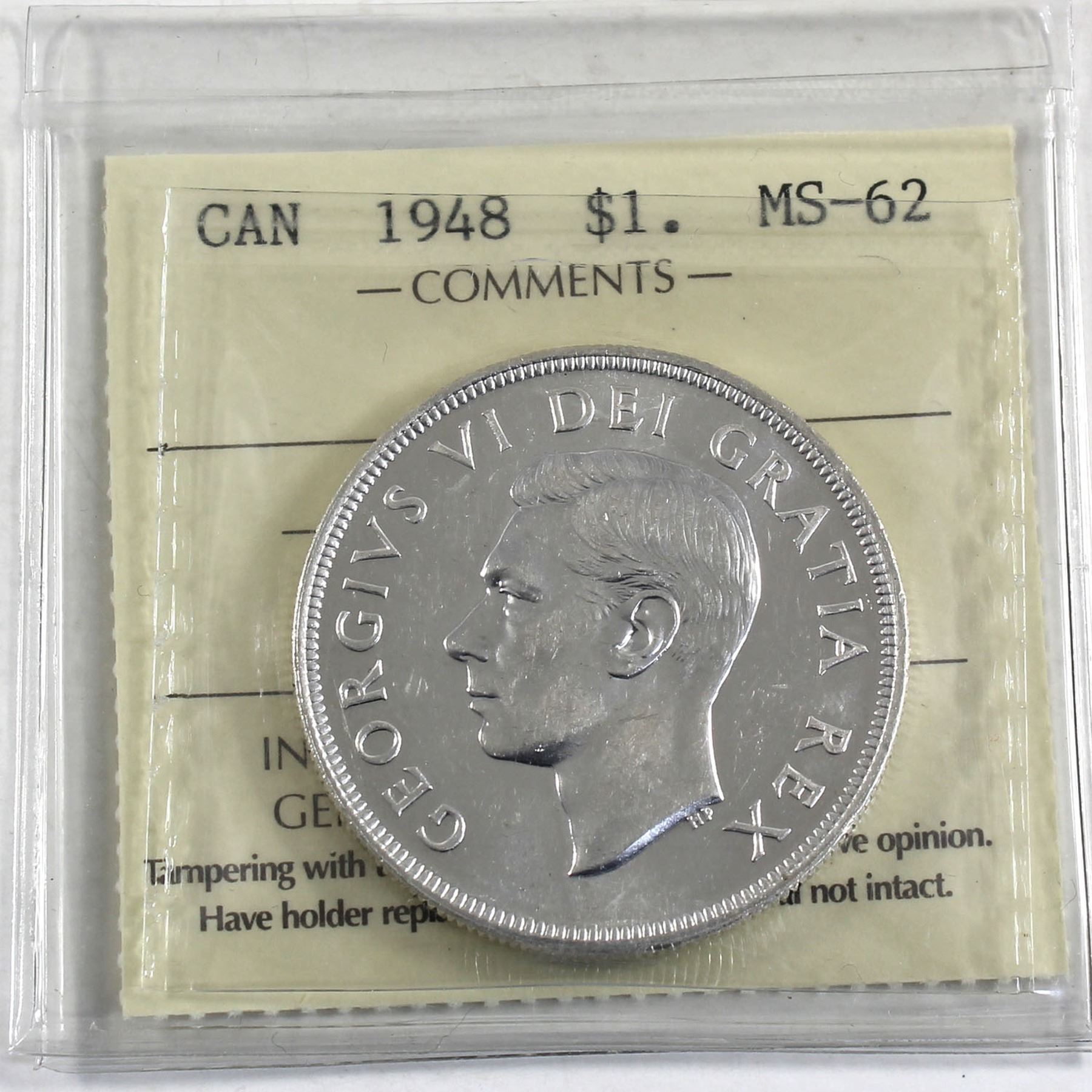 Silver $1 1948 ICCS Certified MS-62! A blast white Key Date coin with a hint of Cameo that adds to the appeal of the coin!