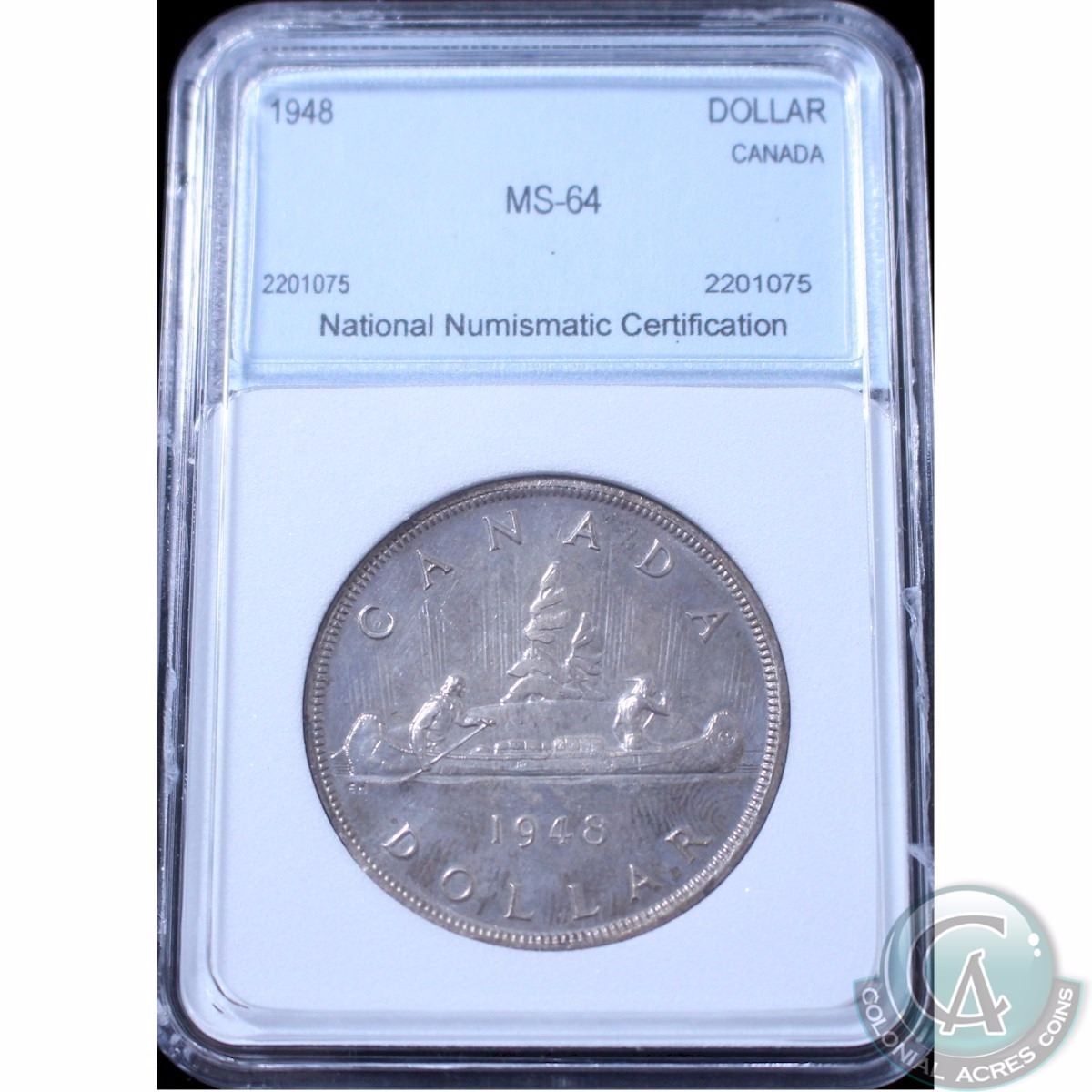 Silver $1 1948 National Numismatic Certification MS-64. We recommend that you view the lot to form your own opinion of the grade. Sold as is, no returns
