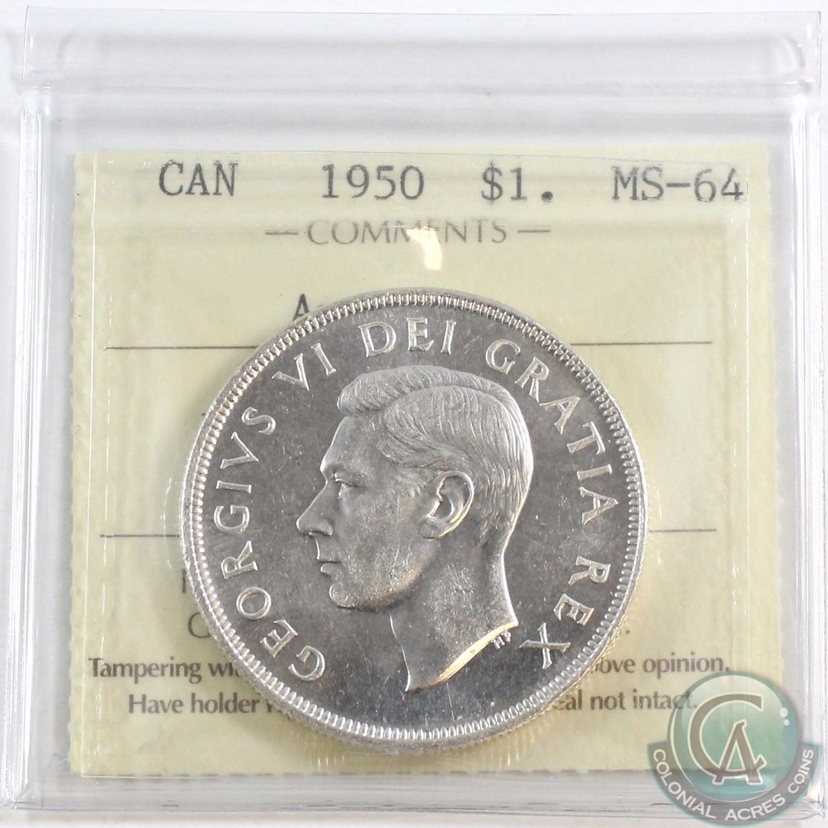 Silver $1 1950 Arnprior ICCS Certified MS-64. Coin has light cameo not mentioned.