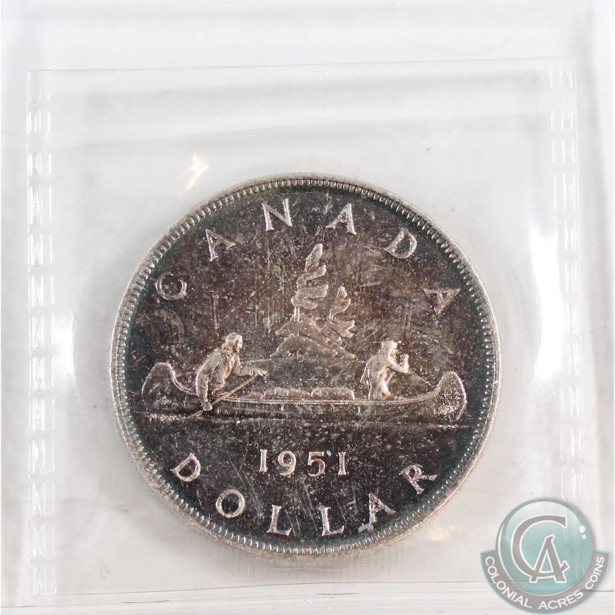 Silver $1 1951 ICCS Certified SP-66. This Coin features beautiful indigo rainbow toning throughout with a rare SWL variety not listed on ICCS holder.
