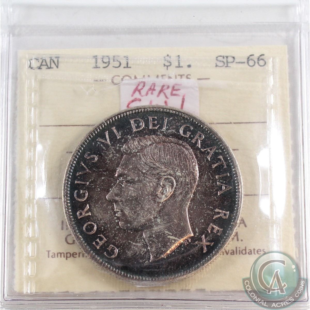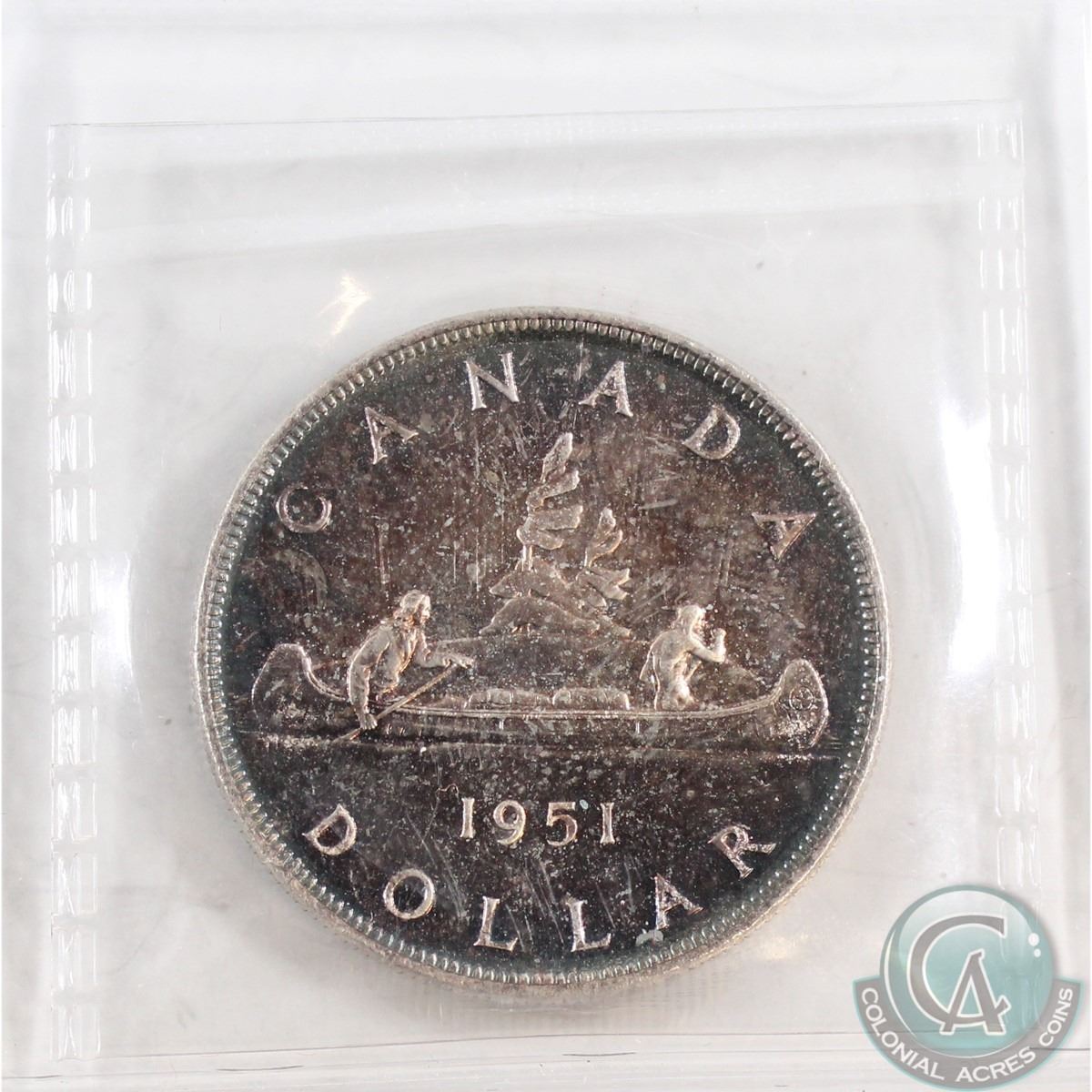 Silver $1 1951 ICCS Certified SP-66. This coin features beautiful indigo rainbow toning throughout with a rare SWL variety not listed on ICCS holder.