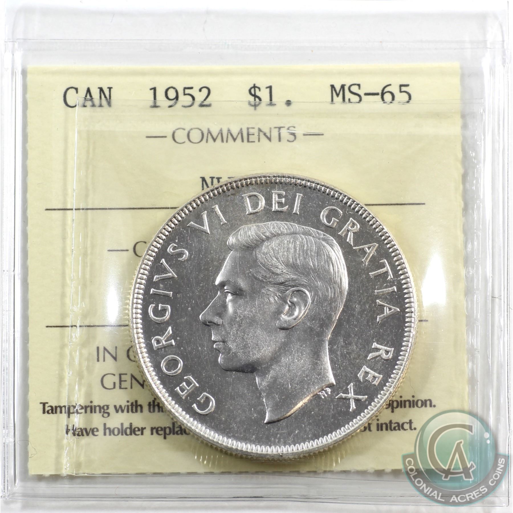 Silver $1 1952 NWL ICCS Certified MS-65. Very tough to find such a nice example in this grade! Worth a premium bid