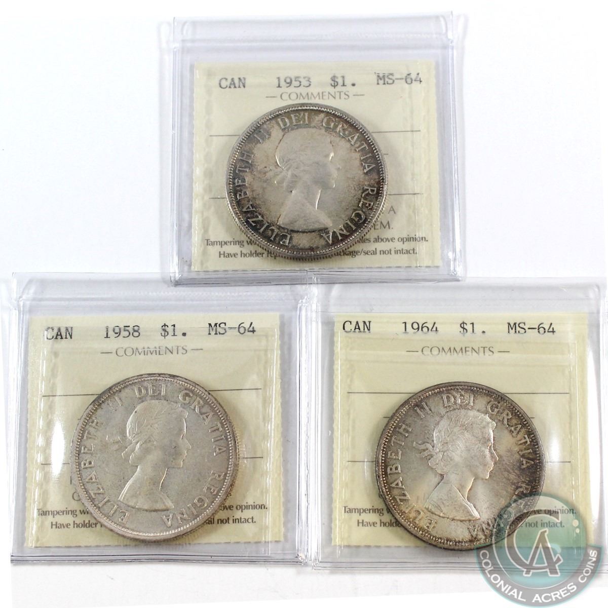 Silver $1 1953 NSF, 1958 & 1964 ICCS Certified MS-64. 3pcs