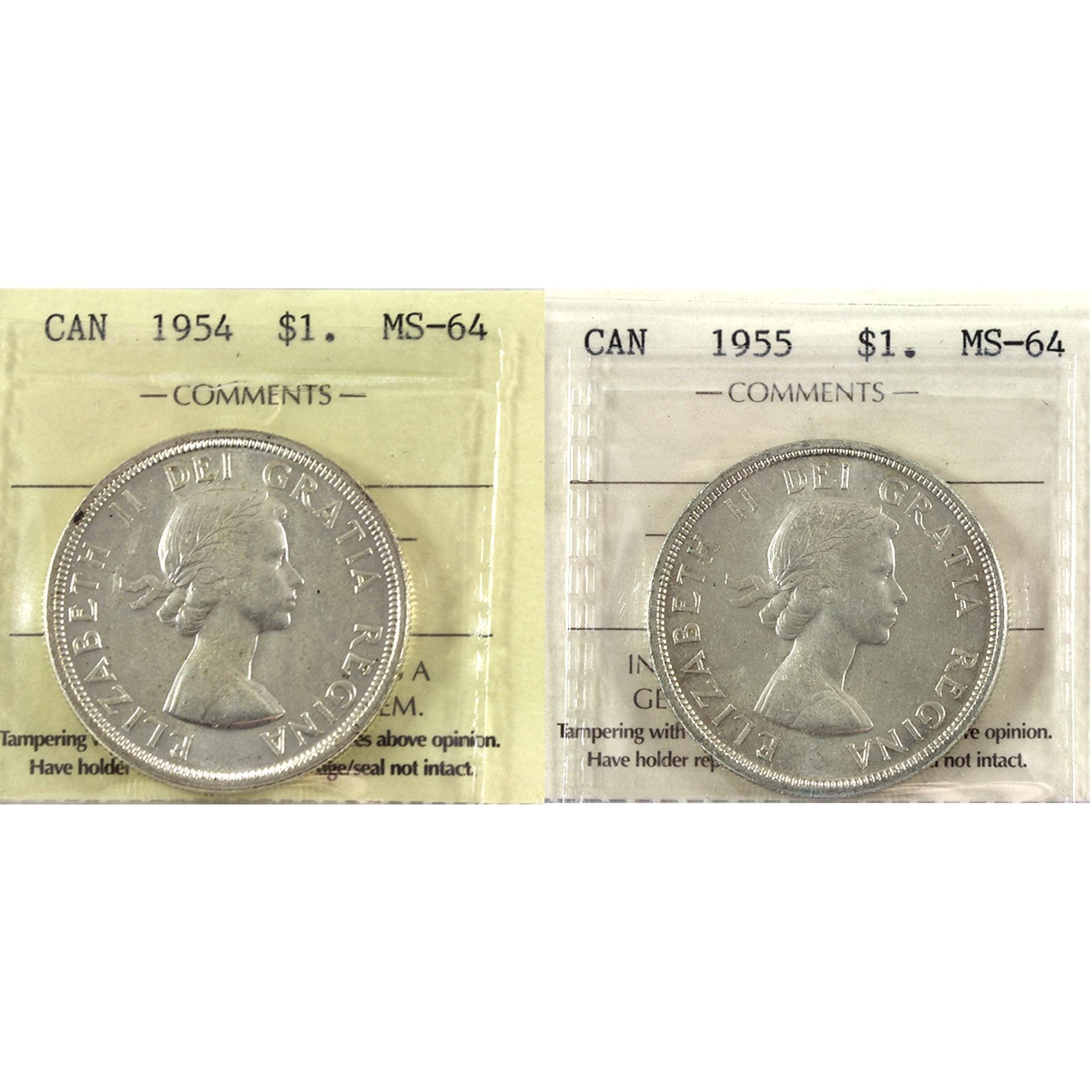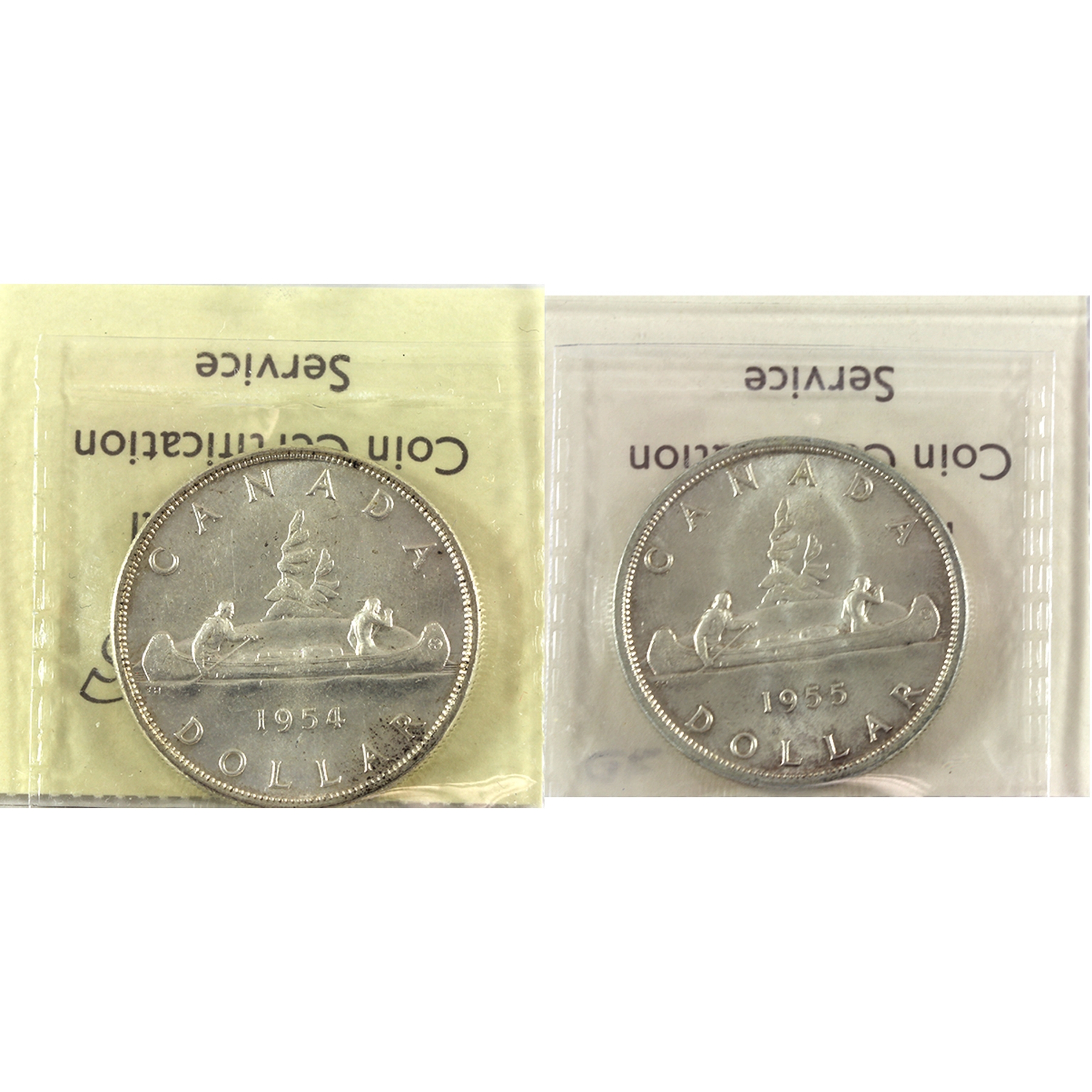 Silver $1 1954 & 1955 ICCS MS64. 2pcs.