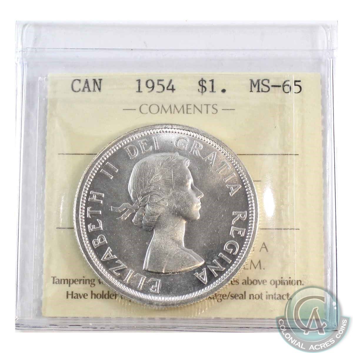 Silver $1 1954 ICCS Certified MS-65! Tied for 2nd Highest Grade with only 1 graded higher. Full Blast white coin!