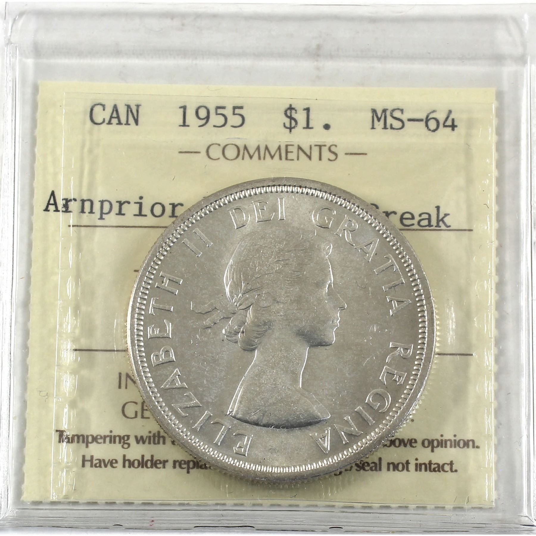 Silver $1 1955 Arnprior With Die Breaks ICCS Certified MS-64! Bright radiant coin with great eye appeal!.