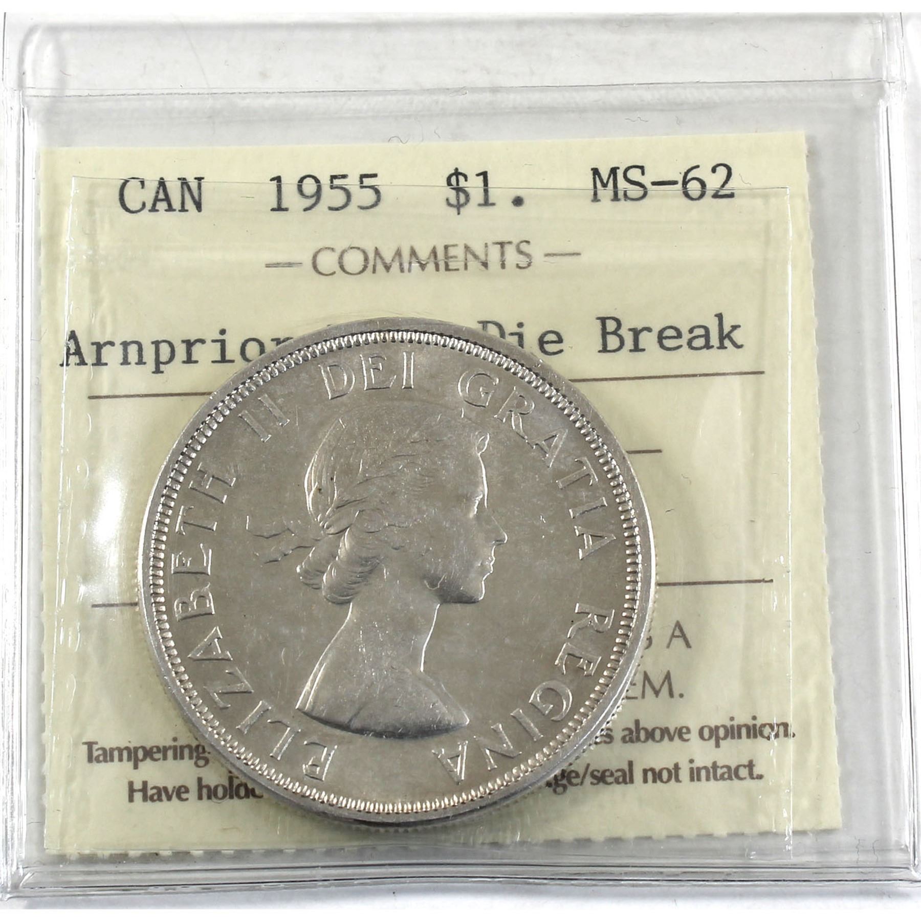 Silver $1 1955 Arnprior with Die Break ICCS Certified MS-62