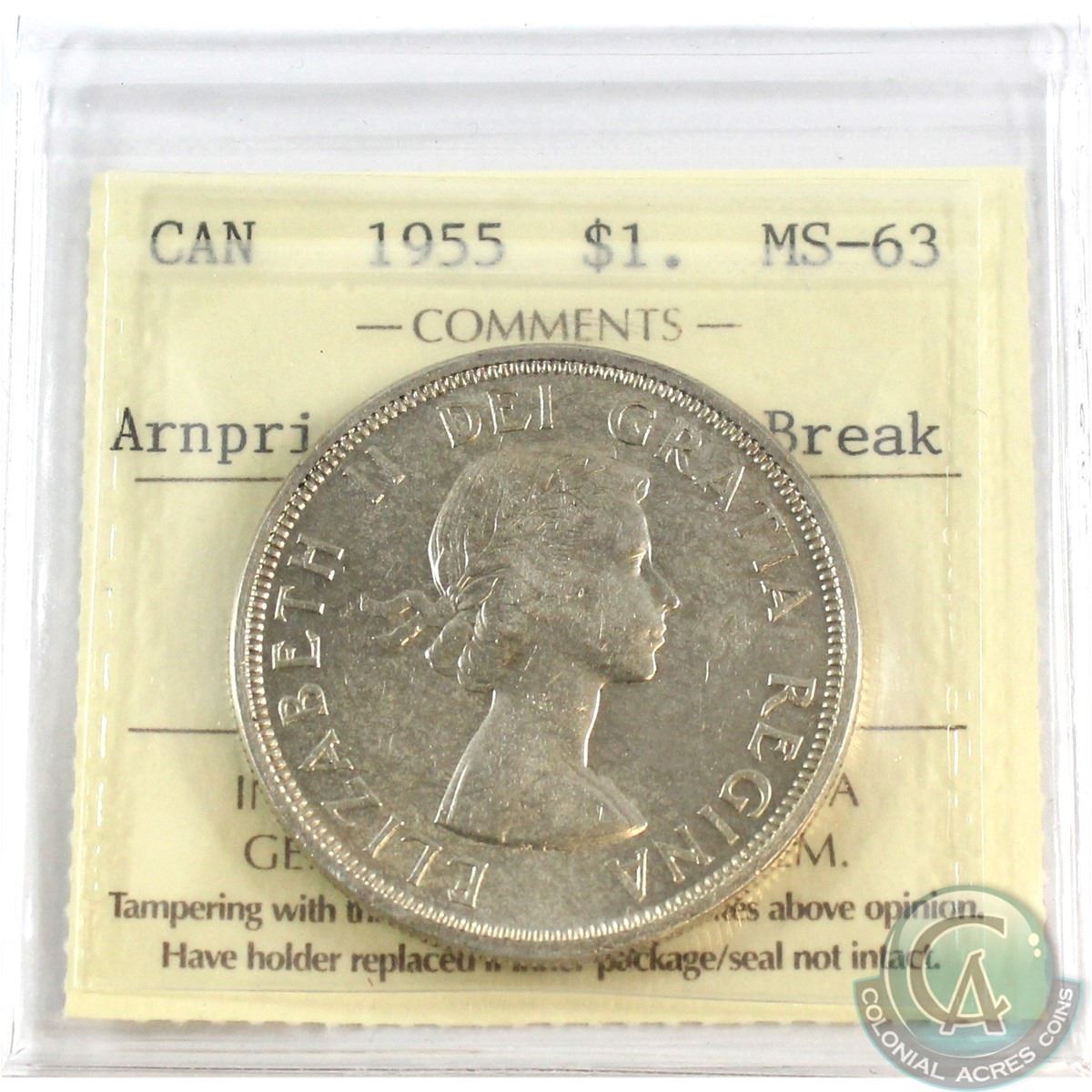 Silver $1 1955 Arnprior with Die Break ICCS Certified MS-63